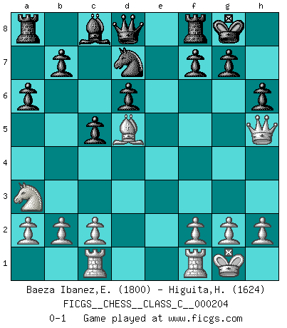 Last move : 0-1 2014 February 16 1:14:22 [Event "FICGS__CHESS__CLASS_C__000204"] [Site "FICGS"] [Date "2013.10.26"] [Round "1"] [White "Baeza Ibanez,Eduardo Alex"] [Black "Higuita,Henry"] [Result "0-1"] [WhiteElo "1800"] [BlackElo "1624"] 1.e4 e5 2.Nf3 d6 3.Nc3 Nf6 4.d4 exd4 5.Nxd4 h6 6.Be2 c5 7.Ndb5 a6 8.Na3 Be7 9.Nd5 Nxe4 10.Bf3 Nf6 11.Qe2 Nxd5 12.Bxd5 O-O 13.Qh5 Bg5 14.O-O Bxc1 15.Raxc1 Nd7 0-1 This chess game has been lost on time (started : 2013.10.26 20:28:13) Philidor's defense Kingside Castling by player Black (move 12) Kingside Castling by player White (move 14) Player Black won this chess game. Follow this game move after move (download)Bobby is the finest Chess player this country ever produced. His memory for the moves, his brilliance in dreaming up combinations, and his fierce determination to win are uncanny. (John Collins) Nur ein wirklich starker Spieler weiß wie schwach er spielt. (Savielly Grigorievitsch Tartakower) Cuando estes solo, cuando te sientas un extraño en el mundo, juega al Ajedrez. Esto levantará tu espiritu y será tu consejero de guerra. (Aristóteles) Les Echecs mettent en conflit, non pas deux intelligences, mais deux volontés. (Lasker) Work expands to fill the time available. (C. Northcote Parkinson, in Parkinson's Laws)