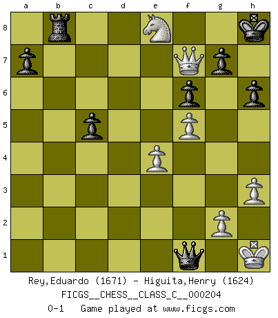 Last move : 0-1 2014 February 18 15:34:8 [Event "FICGS__CHESS__CLASS_C__000204"] [Site "FICGS"] [Date "2013.10.26"] [Round "1"] [White "Rey,Eduardo"] [Black "Higuita,Henry"] [Result "0-1"] [WhiteElo "1671"] [BlackElo "1624"] 1.e4 e5 2.Nf3 d6 3.d4 exd4 4.Nxd4 Be7 5.Nc3 Nf6 6.Bd3 O-O 7.O-O c5 8.Nf5 Nc6 9.Nxe7+ Qxe7 10.Bg5 Be6 11.f4 Bg4 12.Qe1 Qe6 13.f5 Qe5 14.Qh4 Bh5 15.Bxf6 Qxf6 16.Qxh5 Qd4+ 17.Kh1 f6 18.Nb5 Qxb2 19.Nxd6 Ne5 20.Rab1 Qxa2 21.Rxb7 Rab8 22.Rxb8 Rxb8 23.Bc4+ Nxc4 24.Qf7+ Kh8 25.Nxc4 h6 26.h3 Qxc2 27.Nd6 Qd3 28.Ne8 Qxf1+ 0-1 Philidor : Exchange variation Kingside Castling by player Black (move 6) Kingside Castling by player White (move 7) Player Black won this chess game. Follow this game move after move (download)Chess is played with the mind and not with the hands ! (Renaud and Kahn) Du kannst im Schach nur gut werden, wenn du das Spiel liebst. (Robert James Fischer) Solo los afeminados hacen el Enroque. (Rob Sillars) C'est une question de caractère, Beaucoup de gens perdent leur motivation très vite. D'autres, ils sont rares, peuvent la conserver très longtemps. J'aime les échecs, encore aujourd'hui je suis heureux d'analyser des parties. J'aime toujours gagner, je déteste encore perdre. Bien jouer est important pour mon intégrité intellectuelle et morale. Et puis les échecs vivent en ce moment une période historique grâce à Internet. Ils se développent dans les systèmes éducatifs à travers le monde. Ils sortent de leur ghetto, et c'est mon rôle de mener à bien cette révolution. (Gary Kasparov) You can only get smarter by playing a smarter opponent. (Revolver, movie)