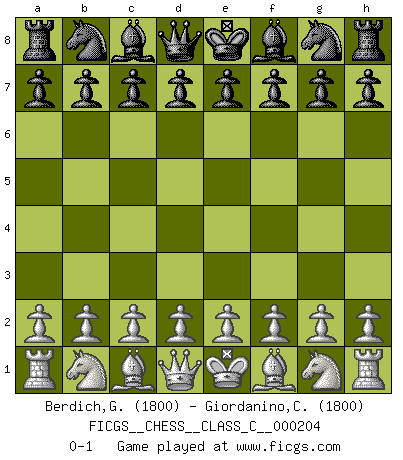 Last move : 0-1 2013 December 5 20:42:50 [Event "FICGS__CHESS__CLASS_C__000204"] [Site "FICGS"] [Date "2013.10.26"] [Round "1"] [White "Berdich,German"] [Black "Giordanino,Claudio"] [Result "0-1"] [WhiteElo "1800"] [BlackElo "1800"] 0-1 This chess game has been lost on time (started : 2013.10.26 20:28:13) Player Black won this chess game. Follow this game move after move (download)I don't believe in psychology. I believe in good moves. (Bobby Fischer) Stil? Ich habe keinen Stil! (Anatoly Karpov) La mitad de las variaciones que son calculadas en una partida de torneo, resultan ser completamente superfluas. Desafortunadamente, nadie sabe por adelantado cual mitad. (Jan Tinman) La tactique est l'élément le plus important du milieu de jeu. (Siegbert Tarrasch) What doesn't kill us makes us stronger. (Friedrich Nietzsche)