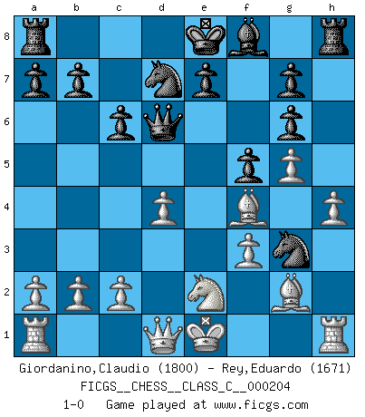 Last move : 1-0 2013 November 18 16:44:48 [Event "FICGS__CHESS__CLASS_C__000204"] [Site "FICGS"] [Date "2013.10.26"] [Round "1"] [White "Giordanino,Claudio"] [Black "Rey,Eduardo"] [Result "1-0"] [WhiteElo "1800"] [BlackElo "1671"] 1.e4 d5 2.exd5 Qxd5 3.Nc3 Qd6 4.d4 Nf6 5.Nf3 Bg4 6.h3 Bh5 7.g4 Bg6 8.Ne5 c6 9.h4 Ne4 10.Ne2 f6 11.Nxg6 hxg6 12.Bg2 f5 13.g5 Nd7 14.f3 Ng3 15.Bf4 1-0 Scandinavian : Pytel-Wade variation Player White won this chess game. Follow this game move after move (download)A thorough understanding of the typical mating continuations makes the most complicated sacrificial combinations leading up to them not only not difficult, but almost a matter of course. (Siegbert Tarrasch) Fallen sollten polizeilich verboten werden. (Savielly Grigorievitsch Tartakower) El Ajedrez es un juego de pelea el cual es puramente intelectual e incluye la suerte. (Richard Reti) Le thème de l'attaque double intervient d'une manière ou d'une autre dans l'immense majorité des combinaisons. (Youri Averbakh) A proverb is a short sentence based on long experience. (Miguel de Cervantes)