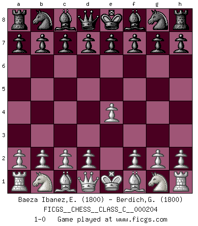 Last move : 1-0 2013 December 7 20:52:54 [Event "FICGS__CHESS__CLASS_C__000204"] [Site "FICGS"] [Date "2013.10.26"] [Round "1"] [White "Baeza Ibanez,Eduardo Alex"] [Black "Berdich,German"] [Result "1-0"] [WhiteElo "1800"] [BlackElo "1800"] 1.e4 1-0 This chess game has been lost on time (started : 2013.10.26 20:28:13) King's pawn Opening Player White won this chess game. Follow this game move after move (download)An attack on the wing should be met by play in the center. (Nimzovitch) Früher wurde jeder komplizierte Zug, jedes interessante Opfer mit großem Beifall und Enthusiasmus aufgenommen. Heute schaltet man einfach seinen Fritz an, und man kann sehen, was los ist, ob der Zug geht oder nicht. (Vladimir Kramnik) Bobby Fischer es el mas grande genio de Ajedrez de todos los tiempos. (Alexander Kotov) Les Echecs sont et restent toujours un combat, un combat intégral comme la boxe, la lutte ou un autre sport, et où il doit y avoir un vainqueur et un vaincu. (Joseph Emil Diemer) Success without honor is an unseasoned dish; it will satisfy your hunger, but it won't taste good. (Joe Paterno)