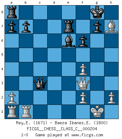 Last move : 1-0 2013 November 18 23:58:2 [Event "FICGS__CHESS__CLASS_C__000204"] [Site "FICGS"] [Date "2013.10.26"] [Round "1"] [White "Rey,Eduardo"] [Black "Baeza Ibanez,Eduardo Alex"] [Result "1-0"] [WhiteElo "1671"] [BlackElo "1800"] 1.e4 d5 2.exd5 Qxd5 3.Nc3 Qd7 4.d4 e6 5.Nf3 Bb4 6.Bd2 Bd6 7.Ne4 Nf6 8.Nxd6+ cxd6 9.Qe2 d5 10.Ne5 Qa4 11.c3 Nbd7 12.g3 Nxe5 13.Qxe5 O-O 14.Bg5 Nd7 15.Qe3 Re8 16.Be2 f6 17.Bf4 e5 18.dxe5 Nxe5 19.O-O Ng6 20.Qf3 Nxf4 21.gxf4 Qc2 22.Qxd5+ Be6 23.Qf3 Qxb2 24.Rfb1 Qc2 25.Bb5 Re7 26.Bd3 Qxc3 27.Bxh7+ 1-0 Scandinavian (centre counter) defense Kingside Castling by player Black (move 13) Kingside Castling by player White (move 19) Player White won this chess game. Follow this game move after move (download)With or without the title, Bobby Fischer was unquestionably the greatest player of his time. (Burt Hochberg) Als ich elf wurde, wurde ich einfach gut. (Robert James Fischer) El Ajedrez lo es todo: arte, ciencia y deporte. (Anatoly Karpov) Les échecs, c'est la lutte contre l'erreur. (Johannes Zukertort) It is not enough to be a good player... you must also play well. (Siegbert Tarrasch)