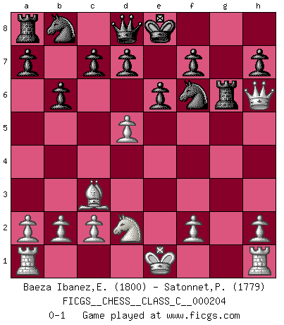 Last move : 0-1 2014 February 9 0:52:25 [Event "FICGS__CHESS__CLASS_C__000204"] [Site "FICGS"] [Date "2013.10.26"] [Round "1"] [White "Baeza Ibanez,Eduardo Alex"] [Black "Satonnet,Patrick"] [Result "0-1"] [WhiteElo "1800"] [BlackElo "1779"] 1.e4 e6 2.Nf3 b6 3.d4 Bb7 4.Nc3 Bb4 5.Bd2 Bxc3 6.Bxc3 Bxe4 7.Nd2 Bb7 8.Qg4 Nf6 9.Qxg7 Rg8 10.Qh6 Bxg2 11.Bxg2 Rxg2 12.d5 Rg6 0-1 This chess game has been lost on time (started : 2013.10.26 20:28:13) French defense Player Black won this chess game. Follow this game move after move (download)Chess is a forcing house where the fruits of character can ripen more fully than in life. (Edward Morgan Foster) Über Karpov: Er war und ist ein Vertreter der russischen Reaktionäre. Das steckt tief in seiner Seele, wehalb ich nicht nett mit ihm umgehen kann. (Viktor Kortschnoi) Siempre es mejor sacrificar los hombres de tu oponente. (Savielly Tartakower) Le pion, dans sa simplicité, marche droit devant lui, mais lorsqu'il prend, il le fait obliquement? Ainsi l'homme, tant qu'il reste pauvre, marche dans la droiture et vit honnêtement, mais lorsqu'il recherche les honneurs, il flatte, se parjure et, par les voies obliques, cherche une position supérieure sur l'échiquier du monde. (Jean de Galles) The problem with manipulation is that people can turn on you. (Horatio Caine, C.S.I. Miami)