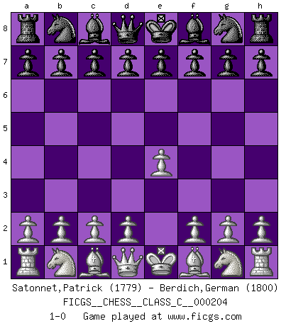 Last move : 1-0 2013 December 5 20:47:21 [Event "FICGS__CHESS__CLASS_C__000204"] [Site "FICGS"] [Date "2013.10.26"] [Round "1"] [White "Satonnet,Patrick"] [Black "Berdich,German"] [Result "1-0"] [WhiteElo "1779"] [BlackElo "1800"] 1.e4 1-0 This chess game has been lost on time (started : 2013.10.26 20:28:13) King's pawn Opening Player White won this chess game. Follow this game move after move (download)It's always better to sacrifice your opponent's men. (Savielly Tartakover) Versuche, dich von der Sklaverei der Eröffnungsvarianten zu befreien. Stattdessen soll man gewisse Typenpositionen erlernen, die man eingehend analysiert. (Aaron Nimzowitsch) Los Peones son el alma de una partida de Ajedrez. (Francois Andre Danican Philidor) Je ne crois pas en la psychologie, je crois aux bons coups. (Robert Fischer) Never risk one's whole fortune unless supported by one's entire army. (Niccolo Machiavelli)