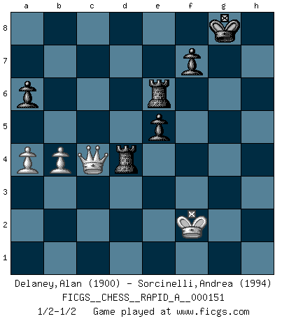 Last move : 1/2-1/2 2014 March 20 8:41:13 [Event "FICGS__CHESS__RAPID_A__000151"] [Site "FICGS"] [Date "2013.10.26"] [Round "1"] [White "Delaney,Alan"] [Black "Sorcinelli,Andrea"] [Result "1/2-1/2"] [WhiteElo "1900"] [BlackElo "1994"] 1.Nf3 c5 2.c4 Nc6 3.d4 cxd4 4.Nxd4 Qb6 5.Nb3 e6 6.a3 Nf6 7.Nc3 Be7 8.e4 O-O 9.Be2 Qc7 10.Be3 b6 11.f4 d6 12.O-O Bb7 13.Qd3 a6 14.Rfd1 Nb8 15.Rac1 Nbd7 16.Nd2 Rac8 17.b4 Rfe8 18.Bf3 Nf8 19.Qe2 N8d7 20.Qf2 Ba8 21.g4 h6 22.h4 Nh7 23.g5 hxg5 24.Kg2 gxh4 25.Rg1 Bf6 26.Kh2 Qd8 27.Na4 b5 28.Nb6 Nxb6 29.Bxb6 Qe7 30.e5 dxe5 31.Bxa8 Rxa8 32.Ne4 exf4 33.Qxf4 e5 34.Qg4 bxc4 35.Bc5 Qe6 36.Nxf6+ Qxf6 37.Rcf1 Qh6 38.Be3 g5 39.Qxc4 Qg6 40.Bxg5 Nxg5 41.Rxg5 Qxg5 42.Rg1 Qxg1+ 43.Kxg1 Rad8 44.Qxh4 Rd6 45.Kf2 R8e6 46.a4 Rd5 47.Qc4 Rd4 1/2-1/2 Reti Opening Kingside Castling by player Black (move 8) Kingside Castling by player White (move 12) 10 pieces endgame at move 44 : White KQPP , Black KRRPPP WHITE : King + 1 Queen 2 Pawns BLACK : King + 2 Rooks 3 Pawns This chess game ended in a draw. Follow this game move after move (download)Combinations have always been the most intriguing aspect of Chess. The masters look for them, the public applauds them, the critics praise them. It is because combinations are possible that Chess is more than a lifeless mathematical exercise. They are the poetry of the game; they are to Chess what melody is to music. They represent the triumph of mind over matter. (Reuben Fine) Schach ist Leben. (Robert James Fischer) El arma más poderosa en el Ajedrez, es tener la próxima movida. (David Bronstein) Plusieurs personnes se sont demandées comment Tal faisait pour gagner... En fait, c'est très simple ! Il met ses pièces au centre de l'échiquier et les sacrifie quelque part ! (David Bronstein) Optimism is a variety of information deficit. Sometimes especially true for correspondence chess games. (Michael Aigner)