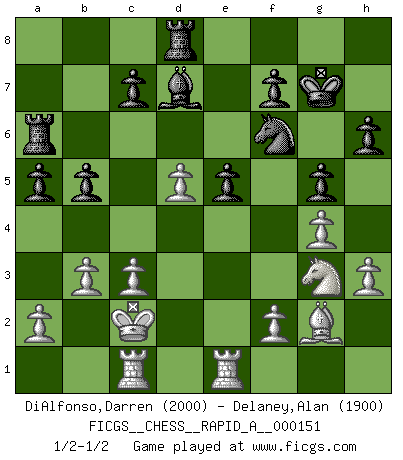 Last move : 1/2-1/2 2014 January 8 22:13:2 [Event "FICGS__CHESS__RAPID_A__000151"] [Site "FICGS"] [Date "2013.10.26"] [Round "1"] [White "DiAlfonso,Darren"] [Black "Delaney,Alan"] [Result "1/2-1/2"] [WhiteElo "2000"] [BlackElo "1900"] 1.d4 d6 2.e4 Nf6 3.Nc3 e5 4.dxe5 dxe5 5.Qxd8+ Kxd8 6.Nf3 Bd6 7.Be3 Ke7 8.h3 h6 9.O-O-O Be6 10.g4 Nbd7 11.Nd5+ Kf8 12.Bg2 g5 13.Ng1 Kg7 14.Ne2 Nb6 15.b3 Ba3+ 16.Kb1 Nbxd5 17.exd5 Bd7 18.Ng3 a5 19.c3 b5 20.Rhe1 Ra6 21.Kc2 Rd8 22.Bc1 Bxc1 23.Rxc1 1/2-1/2 Queen's Pawn Queenside Castling by player White (move 9) This chess game ended in a draw. Follow this game move after move (download)Chess is ruthless: you've got to be prepared to kill people. (Nigel Short) Wenn du nicht weißt was du tun sollst, warte bis dein Gegner eine Idee hat. Sie wird sicher schlecht sein. (Siegbert Tarrasch) El Ajedrez tiene tanto misterio como las mujeres. (Purdy) Les échecs sont un jeu terrible. Si vous n'avez pas le centre, votre adversaire a une position plus libre. Par contre, si vous avez le centre, alors vous avez vraiment quelque chose pour laquelle vous inquiéter ! (Siegbert Tarrasch) If only people were all showed a certain minimum level of niceness; if only people didn't retract verbal draw offers (without draw box ticked) on ficgs; if only people didn't kill; if only people didn't run concentration / extermination camps, if only people didn't drop nuclear bombs on Hiroshima and Nagasaki, and so on - it would be a much more beautiful world. But sadly, things are not so... (Normajean Yates)