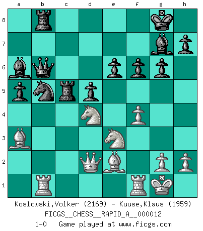 Last move : 1-0 2007 March 31 12:54:25 [Event "FICGS__CHESS__RAPID_A__000012"] [Site "FICGS"] [Date "2007.02.07"] [Round "1"] [White "Koslowski,Volker"] [Black "Kuuse,Klaus"] [Result "1-0"] [WhiteElo "2169"] [BlackElo "1959"] 1.f4 d5 2.Nf3 Nf6 3.e3 g6 4.Be2 Bg7 5.O-O O-O 6.d3 c5 7.d4 cxd4 8.exd4 Nc6 9.c3 Ne4 10.Na3 a6 11.Nc2 f6 12.Ne3 e6 13.Qb3 b5 14.a4 bxa4 15.Qxa4 Qb6 16.Qc2 a5 17.b4 Bb7 18.b5 Na7 19.c4 Rfc8 20.c5 Nxc5 21.dxc5 Rxc5 22.Qd2 Nxb5 23.Rb1 Ba6 24.Nd4 Rb8 25.Ba3 1-0 Bird's Opening Kingside Castling by player White (move 5) Kingside Castling by player Black (move 5) Player White won this chess game. Follow this game move after move (download)The older I grow, the more I value Pawns. (Keres) Die jungen Leute sollen verstehen, dass sie noch etwas von mir lernen können und müssen. (Viktor Kortschnoi) En manos de Fischer's, una diminuta ventaja teórica es tan buena como tener una Reina de ventaja. (Isaac Kashdan) Le jeu d'échecs est comme rejeté hors du temps. (Antoine de Saint-Exupéry) For to win one hundred victories in one hundred battles is not the acme of skill. To subdue the enemy without fighting is the acme of skill. (Sun Tzu)