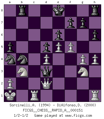 Last move : 1/2-1/2 2013 December 2 18:41:39 [Event "FICGS__CHESS__RAPID_A__000151"] [Site "FICGS"] [Date "2013.10.26"] [Round "1"] [White "Sorcinelli,Andrea"] [Black "DiAlfonso,Darren"] [Result "1/2-1/2"] [WhiteElo "1994"] [BlackElo "2000"] 1.e4 e6 2.d4 d5 3.Nc3 Nf6 4.Bg5 Be7 5.e5 Nfd7 6.h4 h6 7.Bxe7 Qxe7 8.f4 a6 9.Qd2 c5 10.Nf3 b5 11.O-O-O c4 12.g4 b4 13.Ne2 Nb6 14.f5 c3 15.Qf4 cxb2+ 16.Kxb2 Qc7 17.Rc1 Nc6 18.Ka1 Rb8 19.Nd2 a5 20.c3 Ba6 21.Qe3 Qb7 22.Ng3 bxc3 23.Qxc3 Nb4 24.Nb3 Na4 25.Bxa6 Qxa6 26.Qd2 Qd3 1/2-1/2 French : Albin-Alekhine-Chatard attack Queenside Castling by player White (move 11) This chess game ended in a draw. Follow this game move after move (download)Everything is in a state of flux, and this includes the world of Chess. (Mikhail Botvinnik) Rauchen ist dem Schachspieler bei seiner Arbeit, also im Wettkampf, untersagt. (Viktor Kortschnoi) Yo no le temo a Spassky. Todos saben que yo soy el mejor. Uno no necesita un torneo para probarlo. (Bobby Fischer) Les pièces de l'échiquier étaient impitoyables. Elles le retenaient, elles l'absorbaient. Il y avait de l'horreur en cela, mais aussi une harmonie unique. Car, qu'y a-t-il dans le monde, à part les échecs ? (V. Nabokov) First of all, we have to go back to the classical time control. (Anatoly Karpov)