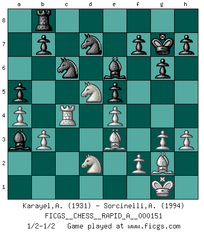 Last move : 1/2-1/2 2013 December 1 20:26:4 [Event "FICGS__CHESS__RAPID_A__000151"] [Site "FICGS"] [Date "2013.10.26"] [Round "1"] [White "Karayel,Atagun"] [Black "Sorcinelli,Andrea"] [Result "1/2-1/2"] [WhiteElo "1931"] [BlackElo "1994"] 1.d4 Nf6 2.c4 g6 3.g3 Bg7 4.Bg2 d5 5.cxd5 Nxd5 6.Nf3 Nb6 7.Nc3 Nc6 8.e3 O-O 9.O-O Re8 10.Qd2 e5 11.d5 Na5 12.Rd1 c6 13.dxc6 Nxc6 14.Qxd8 Rxd8 15.Rxd8+ Nxd8 16.a4 a5 17.Rb1 Nc6 18.b3 Bf8 19.e4 Bg4 20.Be3 Nd7 21.Nd5 Kg7 22.Rc1 Rb8 23.Nd2 Ba3 24.Rc4 Be6 25.h3 1/2-1/2 King's Indian : 3.g3, counterthrust variation Kingside Castling by player Black (move 8) Kingside Castling by player White (move 9) This chess game ended in a draw. Follow this game move after move (download)Chess is no whit inferior to the violin, and we have a large number of professional violinists. (Mikhail Botvinnik) Wie gewinnt Tal? Er entwickelt alle seine Figuren in die Brettmitte und opfert sie dann irgendwo. (Robert James Fischer) No es suficiente ser un buen jugador, se debe también de jugar bién. (Siegbert Tarrasch) Ne tendez aucun piège pour le plaisir ! Ne jouez rien dans l'espoir que l'adversaire réagisse de façon stupide ! Prenez toujours pour acquis que l'adversaire va trouver le meilleur coup ! Ne jouez jamais de coup dans l'espoir que l'adversaire ne voie pas la menace ! Chacun de vos coups doit améliorer la position d'une façon ou d'une autre. There are three kinds of lies: lies, damned lies and statistics. (Mark Twain)