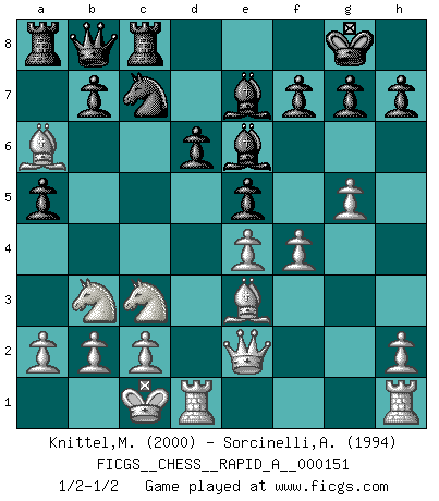 Last move : 1/2-1/2 2013 November 1 6:52:5 [Event "FICGS__CHESS__RAPID_A__000151"] [Site "FICGS"] [Date "2013.10.26"] [Round "1"] [White "Knittel,Martin"] [Black "Sorcinelli,Andrea"] [Result "1/2-1/2"] [WhiteElo "2000"] [BlackElo "1994"] 1.e4 c5 2.Nf3 d6 3.d4 cxd4 4.Nxd4 Nf6 5.Nc3 a6 6.Be3 e5 7.Nb3 Be7 8.f3 Be6 9.Qd2 O-O 10.O-O-O a5 11.Bb5 Na6 12.Qe2 Qb8 13.g4 Rc8 14.g5 Ne8 15.f4 Nec7 16.Bxa6 1/2-1/2 Sicilian : Najdorf, Byrne (English) attack Kingside Castling by player Black (move 9) Queenside Castling by player White (move 10) This chess game ended in a draw. Follow this game move after move (download)It is not enough to be a good player... you must also play well. (Siegbert Tarrasch) Modernes Schach sorgt sich zuviel um Dinge wie Bauernstruktur usw. Vergessen Sie das, Schachmatt beendet das Spiel! (Nigel Short) Tu eres para mi la Reina en d8 y yo soy el Peón en d7!!. (GM Eduard Gufeld) Le temps de noter son nom sur la feuille de partie, j'étais déjà en zeitnot ! D'un modeste amateur apparié lors de la première ronde d'un open contre le grand-maître Azmaïparashvili. Without deviation from the norm, progress is not possible. (Frank Zappa)