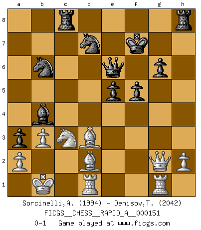 Last move : 0-1 2013 November 18 21:16:43 [Event "FICGS__CHESS__RAPID_A__000151"] [Site "FICGS"] [Date "2013.10.26"] [Round "1"] [White "Sorcinelli,Andrea"] [Black "Denisov,Timofey"] [Result "0-1"] [WhiteElo "1994"] [BlackElo "2042"] 1.e4 c5 2.Nf3 d6 3.d4 cxd4 4.Nxd4 Nf6 5.Nc3 a6 6.Be3 e6 7.f3 b5 8.g4 b4 9.Nce2 h6 10.Qd2 e5 11.Nf5 d5 12.O-O-O Be6 13.Kb1 Nc6 14.Nc1 dxe4 15.Qe2 Qc7 16.Nb3 h5 17.fxe4 hxg4 18.Bg5 Nd7 19.Ne3 a5 20.Nd5 Qc8 21.Be3 a4 22.Nc1 a3 23.b3 Bxd5 24.exd5 Ne7 25.Bd2 Nxd5 26.Qxg4 Qc6 27.Bc4 N5b6 28.Bd3 Rc8 29.Ne2 g6 30.c4 bxc3 31.Nxc3 f5 32.Qg3 Kf7 33.Rhg1 Qe6 34.Qg2 Bb4 0-1 Sicilian : Najdorf, Byrne (English) attack Queenside Castling by player White (move 12) Player Black won this chess game. Follow this game move after move (download)Every Pawn is a potential Queen. (James Mason) Der Traum, für den ich lebe, ist der von einem freien Russland. Viele mögen sagen: Russland hat doch ein Parlament, einen gewählten Präsidenten. Aber ich spüre, dass in meiner Heimat die Angst wiederkehrt. Eine Angst, sich frei zu äußern, bestimmte Dinge zu tun (Garry Kasparov) El Ajedrez es como la guerra en un tablero. (Bobby Fischer) 'L'échange des dames est un coup dur pour les deux adversaires...' Un journaliste lors d'une partie du match Spassky-Fischer Follow your passion, and success will follow you. (Arthur Buddhold)