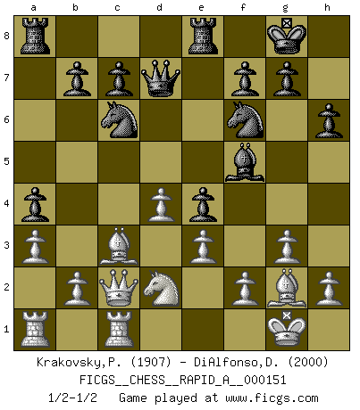Last move : 1/2-1/2 2013 December 3 21:40:22 [Event "FICGS__CHESS__RAPID_A__000151"] [Site "FICGS"] [Date "2013.10.26"] [Round "1"] [White "Krakovsky,Peter"] [Black "DiAlfonso,Darren"] [Result "1/2-1/2"] [WhiteElo "1907"] [BlackElo "2000"] 1.c4 e5 2.Nc3 Nf6 3.Nf3 Nc6 4.g3 Bb4 5.Bg2 O-O 6.O-O d6 7.d3 h6 8.Bd2 a5 9.a3 Bxc3 10.Bxc3 a4 11.Qc2 Re8 12.d4 e4 13.Nd2 d5 14.e3 Bf5 15.cxd5 Qxd5 16.Rfc1 Qd7 1/2-1/2 English Opening Kingside Castling by player Black (move 5) Kingside Castling by player White (move 6) This chess game ended in a draw. Follow this game move after move (download)Chess is thirty to forty percent psychology. You don't have this when you play a computer. I can't confuse it. (Judith Polgar) Das Blackmar-Diemer-Gambit verändert den ganzen Menschen! (Emil Joseph Diemer) Evita las multitudes. Haz independientemente tu propio razonamiento. Trata de ser el jugador de Ajedrez, no la pieza de Ajedrez. (Ralph Charell) Les échecs sont un jeu par leur forme, un art par leur essence et une science par sa difficulté d'acquisition. Ils peuvent vous procurer autant de plaisir qu'un bon livre ou une belle musique, mais vous n'aurez une réelle joie que si vous arrivez à bien jouer. (Tigran Petrosian) There is far too much law for those who can afford it and far too little for those who cannot. (Derek Bok)