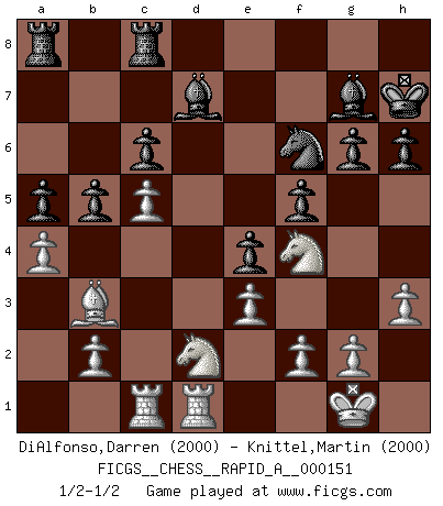 Last move : 1/2-1/2 2013 December 20 5:27:25 [Event "FICGS__CHESS__RAPID_A__000151"] [Site "FICGS"] [Date "2013.10.26"] [Round "1"] [White "DiAlfonso,Darren"] [Black "Knittel,Martin"] [Result "1/2-1/2"] [WhiteElo "2000"] [BlackElo "2000"] 1.d4 Nf6 2.c4 e6 3.Nf3 d5 4.Nc3 c6 5.Bg5 h6 6.Bxf6 Qxf6 7.e3 Nd7 8.Bd3 dxc4 9.Bxc4 g6 10.O-O Bg7 11.Qc2 O-O 12.Ne4 Qe7 13.Bb3 e5 14.Ng3 Kh8 15.Rac1 f5 16.Ne2 Kh7 17.Rfd1 e4 18.Nd2 Nf6 19.h3 a5 20.Nf4 Bd7 21.a3 b5 22.a4 Rfc8 23.Qc5 Qxc5 24.dxc5 1/2-1/2 Queen's pawn game Kingside Castling by player White (move 10) Kingside Castling by player Black (move 11) This chess game ended in a draw. Follow this game move after move (download)You need not play well - just help your opponent to play badly. (Genrikh Chepukaitis) Ich bin Weltmeister und muß mit niemandem irgend etwas diskutieren. (Viswanathan Anand) No existe un remordimiento como el remordimiento del Ajedrez. (H. G. Wells) Les sacrifices démontrent seulement que quelqu'un a gaffé. (Savielly Tartacover) You can't play chess if you're groggy from pills. (Anatoly Karpov)
