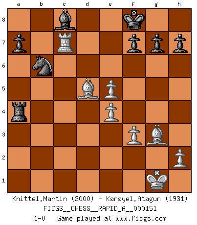 Last move : 1-0 2014 March 3 18:32:36 [Event "FICGS__CHESS__RAPID_A__000151"] [Site "FICGS"] [Date "2013.10.26"] [Round "1"] [White "Knittel,Martin"] [Black "Karayel,Atagun"] [Result "1-0"] [WhiteElo "2000"] [BlackElo "1931"] 1.d4 d5 2.c4 e6 3.Nf3 Nf6 4.Nc3 Be7 5.Bf4 dxc4 6.e3 Nd5 7.Bg3 Nxc3 8.bxc3 Qd5 9.Be2 Qc6 10.Ne5 Qxg2 11.Bf3 Qh3 12.Nxc4 Bd8 13.Rb1 Nd7 14.Na5 Qf5 15.Nxb7 Rb8 16.c4 e5 17.e4 Qg5 18.Nxd8 Rxb1 19.Qxb1 Qxd8 20.dxe5 O-O 21.O-O Qe7 22.Qb2 Nb6 23.Be2 Rd8 24.f3 Nxc4 25.Qc3 Nb6 26.Rc1 c5 27.Qxc5 Qxc5+ 28.Rxc5 Rd2 29.Bf1 Rxa2 30.Bc4 Ra4 31.Bd5 Kf8 32.Rc7 1-0 Queen's gambit declined Kingside Castling by player Black (move 20) Kingside Castling by player White (move 21) Player White won this chess game. Follow this game move after move (download)Later, I began to succeed in decisive games. Perhaps because I realized a very simple truth: not only was I worried, but also my opponent. (Mikhail Tal) Stil? Ich habe keinen Stil! (Anatoly Karpov) El Ajedrez, como cualquier actividad creativa, solo puede existir a través del esfuerzo combinado de aquellos que tienen talento creativo y de aquellos que poseen la habilidad de organizar su trabajo creativo. (Mikhail Botvinnik) Karpov est une pièce de musée. (Garry Kasparov) Remember : Your focus determines your reality. (Qui-Gon Jinn in Star Wars ep.1)