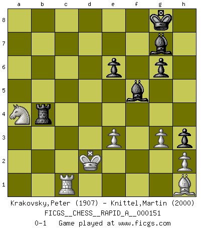 Last move : 0-1 2014 February 17 1:15:6 [Event "FICGS__CHESS__RAPID_A__000151"] [Site "FICGS"] [Date "2013.10.26"] [Round "1"] [White "Krakovsky,Peter"] [Black "Knittel,Martin"] [Result "0-1"] [WhiteElo "1907"] [BlackElo "2000"] 1.c4 e5 2.Nc3 Nc6 3.g3 g6 4.Bg2 Bg7 5.Rb1 a5 6.d3 Nf6 7.Nf3 O-O 8.O-O d6 9.Bg5 h6 10.Bxf6 Bxf6 11.a3 Bg7 12.b4 axb4 13.axb4 Ne7 14.b5 c6 15.Qc2 d5 16.Nd2 h5 17.bxc6 bxc6 18.Nb3 h4 19.cxd5 cxd5 20.Nc5 h3 21.Bh1 Bg4 22.N3a4 Ra7 23.e3 Qa5 24.Nb6 Rc7 25.Qa4 Qxa4 26.Ncxa4 Rd8 27.Rfc1 Rxc1+ 28.Rxc1 e4 29.dxe4 d4 30.Nc4 Rc8 31.Kf1 Rc7 32.Ke1 dxe3 33.fxe3 Nc8 34.Kd2 Rd7+ 35.Kc2 Be2 36.Ncb6 Nxb6 37.Nxb6 Rb7 38.Na4 Bg4 39.e5 Bf5+ 40.Kd2 Rb4 41.e6 fxe6 0-1 This chess game has been lost on time (started : 2013.10.26 22:30:45) English : Closed, 5.Rb1 Kingside Castling by player Black (move 7) Kingside Castling by player White (move 8) Player Black won this chess game. Follow this game move after move (download)All I want to do, ever, is just play Chess. (Bobby Fischer) Ein typischer, sehr verbreiteter Gedankenschädling ist der, daß der betreffende Amateur von der Annanhme ausgeht, daß jeder einzelne Zug etwas zu leisten habe. (Aaron Nimzowitsch) Desconfianza es la característica mas necesaria de un jugador de Ajedrez. (Siegbert Tarrasch) L'action d'une oeuvre littéraire se déroule sur un champ de bataille. Les masques et les types du drame moderne correspondent aux pièces du jeu d'échecs. L'intrigue correspond aux coups et aux gambits, c'est à dire aux techniques du jeu telles qu'utilisées et interprétées par les joueurs. Les tactiques et les péripéties [mouvements] correspondent aux coups exécutés par l'adversaire. (Viktor Shklovsky) Macintosh - we might not get everything right, but at least we knew the century was going to end. (Douglas Adams)