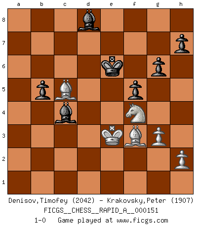 Last move : 1-0 2014 February 25 13:53:23 [Event "FICGS__CHESS__RAPID_A__000151"] [Site "FICGS"] [Date "2013.10.26"] [Round "1"] [White "Denisov,Timofey"] [Black "Krakovsky,Peter"] [Result "1-0"] [WhiteElo "2042"] [BlackElo "1907"] 1.d4 d5 2.c4 c6 3.Nf3 Nf6 4.Qc2 e6 5.Nbd2 c5 6.dxc5 Bxc5 7.cxd5 Qc7 8.e3 Nxd5 9.b3 Be7 10.Qxc7 Nxc7 11.Bb2 O-O 12.Rc1 Nc6 13.a3 Bd7 14.Be2 Rac8 15.O-O Rfd8 16.b4 f6 17.Rfd1 e5 18.Ne4 Be6 19.Nfd2 Rd7 20.Nb3 Rxd1+ 21.Bxd1 Bd5 22.f3 b6 23.Ng3 Nd8 24.f4 exf4 25.Nf5 Bf8 26.Nbd4 Nde6 27.Nb5 a5 28.Nfd4 axb4 29.axb4 Bxb4 30.Nxe6 Bxe6 31.Rxc7 fxe3 32.Bd4 Rxc7 33.Nxc7 Bc4 34.Bxe3 b5 35.Na6 Bc3 36.Bc5 Kf7 37.Kf2 f5 38.Nb4 Be5 39.g3 Ke6 40.Ke3 g6 41.Nd3 Bg7 42.Bb4 Kd7 43.Nf4 Bh6 44.Bc5 Kc6 45.Bd4 Bg5 46.Bf3+ Kd6 47.Bg7 Bd8 48.Bf8+ Ke5 49.Nd3+ Kf6 50.Bc5 Ke6 51.Nf4+ 1-0 This chess game has been lost on time (started : 2013.10.26 22:30:45) QGD Slav : 3.Nf3 Kingside Castling by player Black (move 11) Kingside Castling by player White (move 15) Player White won this chess game. Follow this game move after move (download)The passed Pawn is a criminal, who should be kept under lock and key. Mild measures, such as police surveillance, are not sufficient. (Aaron Nimzovich) Wie kann ich Remis annehmen? Ich weiß ja gar nicht, wie ich stehe! (Fritz Sämisch) Haz el enroque temprano y seguido. (Rob Sillars) Le joueur d'Echecs qui veut atteindre le top est obligé de développer son propre credo créatif. Alexeï Stepanovicth Souétine. Il est facile d'écrire des livres ! Ce qui est difficile, c'est de jouer ! (Alexeï Stepanovicth Souétine) Whoever said the pen is mightier than the sword obviously never encountered automatic weapons. (US General Douglas MacArthur)