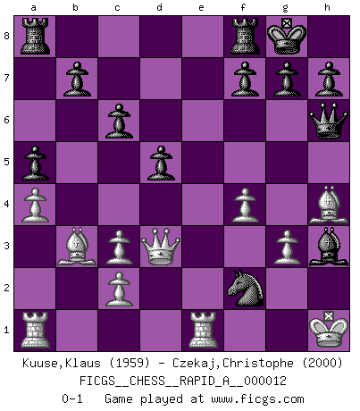Last move : 0-1 2007 May 14 21:10:7 [Event "FICGS__CHESS__RAPID_A__000012"] [Site "FICGS"] [Date "2007.02.07"] [Round "1"] [White "Kuuse,Klaus"] [Black "Czekaj,Christophe"] [Result "0-1"] [WhiteElo "1959"] [BlackElo "2000"] 1.e4 e5 2.Nf3 Nc6 3.Bb5 Nf6 4.Nc3 Bd6 5.O-O O-O 6.d4 exd4 7.Nxd4 Nxd4 8.Qxd4 Qe7 9.Bg5 Bxh2+ 10.Kh1 Be5 11.Qd3 Qe6 12.f4 Bxc3 13.bxc3 Nxe4 14.Bh4 c6 15.Bc4 d5 16.Bb3 a5 17.a4 Qh6 18.g3 Bh3 19.Rfe1 Nf2+ 0-1 This chess game has been lost on time (started : 2007.02.07 21:3:10) Ruy Lopez : Berlin defense Kingside Castling by player White (move 5) Kingside Castling by player Black (move 5) Player Black won this chess game. Follow this game move after move (download)I like to say that Bobby Fischer was the greatest player ever. But what made Fischer a genius was his ability to blend an American freshness and pragmatism with Russian ideas about strategy. (Bruce Pandolfini) Jeder leidlich begabte Spieler, er braucht keineswegs hervorragend veranlagt zu sein, kann es zum Meister bringen. Aber das ist ja auch gar nicht nötig! Der richtige Standpunkt ist es, zu seinem Vergnügen zu spielen, und man glaube ja nicht, dass der Genuss proportional dem Können sei. (Siegbert Tarrasch) ¿Que sería del Ajedrez sin errores graciosos?. (Kurt Richter) Vous m'avez demandé de vous exposer quel est le fondement de la prière. Je ne fais que préparer les pièces du jeu sur la table... Nous sera-t-il permis d'en adopter les règles et si nous les appliquons scrupuleusement nous ne tarderons pas à faire mat le Roi divin ! Il ne pourra échapper à nos mains. (Sainte Thérèse d'Avila, Chemin de perfection) Statistics can be made to prove anything - even the truth. (Author unknown)