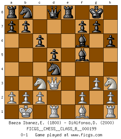 Last move : 0-1 2014 February 13 1:8:10 [Event "FICGS__CHESS__CLASS_B__000199"] [Site "FICGS"] [Date "2013.10.29"] [Round "1"] [White "Baeza Ibanez,Eduardo Alex"] [Black "DiAlfonso,Darren"] [Result "0-1"] [WhiteElo "1800"] [BlackElo "2000"] 1.e4 e6 2.d4 d5 3.Nc3 Nf6 4.exd5 exd5 5.Bg5 Be7 6.Qe2 O-O 7.O-O-O h6 8.Bf4 Re8 9.Qd3 c6 10.Qg3 Nh5 11.Qf3 Nxf4 12.g3 Ne6 13.Kb1 Bf6 14.Nh3 Nxd4 15.Qd3 Bf5 0-1 This chess game has been lost on time (started : 2013.10.29 20:11:40) French defense Kingside Castling by player Black (move 6) Queenside Castling by player White (move 7) Player Black won this chess game. Follow this game move after move (download)Fischer is an American Chess tragedy on par with Morphy and Pillsbury. (Mig Greengard) Ein unbeabsichtigtes Patt ist der Gipfel der Dummheit. (Anonymous) El poder defensivo de una pieza clavada, solamente es imaginario. (Aaron Nimzovich) RxDa4 pat (...) You know what they say : You lie down with the Devil, you wake up in Hell. (Horatio Caine, C.S.I. Miami)