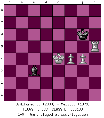 Last move : 1-0 2014 February 7 21:36:18 [Event "FICGS__CHESS__CLASS_B__000199"] [Site "FICGS"] [Date "2013.10.29"] [Round "1"] [White "DiAlfonso,Darren"] [Black "Meli,Cosimo Leonardo"] [Result "1-0"] [WhiteElo "2000"] [BlackElo "1979"] 1.d4 f5 2.Bg5 h6 3.Bh4 g5 4.e3 Nf6 5.Bg3 d6 6.h4 Rg8 7.hxg5 hxg5 8.Nc3 e6 9.Qd2 Qe7 10.O-O-O a6 11.f3 Nc6 12.e4 f4 13.Bf2 Bd7 14.Kb1 Qf7 15.d5 exd5 16.exd5 Ne5 17.Nge2 Rg7 18.Nd4 Nxd5 19.Nxd5 Qxd5 20.Nf5 Qxd2 21.Nxg7+ Bxg7 22.Rxd2 Kf7 23.Bd4 Re8 24.Bc3 Bf5 25.Rd1 Kg6 26.Re1 Rg8 27.a4 Rb8 28.a5 Bf6 29.Kc1 Rd8 30.Kd2 Bg7 31.Be2 Rd7 32.Reg1 Be6 33.g3 Rf7 34.g4 Rd7 35.Re1 Bc4 36.Bxe5 dxe5 37.Kc1 Bxe2 38.Rxe2 Rd5 39.b4 Rb5 40.Re4 c5 41.c3 cxb4 42.Rxb4 Rxb4 43.cxb4 Bf8 44.b5 axb5 45.Rd1 Bb4 46.Rd5 Bxa5 47.Rxe5 Bd8 48.Rd5 Ba5 49.Kc2 Kh6 50.Rxb5 b6 51.Kb3 Kg6 52.Kc4 Kf6 53.Kd4 Kg6 54.Ke5 Bc3+ 55.Kd5 Ba5 56.Ke6 Bc3 57.Rxb6 Bd4 58.Rb8 Kg7 59.Kf5 Kh6 60.Rg8 Kh7 61.Rxg5 Kh6 62.Rh5+ Kg7 63.Kxf4 Kg6 64.Ke4 Bc3 65.f4 1-0 Dutch, 2.Bg5 variation Queenside Castling by player White (move 10) 10 pieces endgame at move 47 : White KRPP , Black KBPPPP WHITE : King + 1 Rook 2 Pawns BLACK : King + 1 Bishop 4 Pawns 9 pieces endgame at move 50 : White KRPP , Black KBPPP WHITE : King + 1 Rook 2 Pawns BLACK : King + 1 Bishop 3 Pawns 8 pieces endgame at move 57 : White KRPP , Black KBPP WHITE : King + 1 Rook 2 Pawns BLACK : King + 1 Bishop 2 Pawns 7 pieces endgame at move 61 : White KRPP , Black KBP WHITE : King + 1 Rook 2 Pawns BLACK : King + 1 Bishop 1 Pawn 6 pieces endgame at move 63 : White KRPP , Black KB WHITE : King + 1 Rook 2 Pawns BLACK : King + 1 Bishop Player White won this chess game. Follow this game move after move (download)The mistakes are there, waiting to be made. (Savielly Tartakower) Spiel ein langweiliges Spiel zu Ende und lustige Dinge können passieren. (Hans Ree) Una mala movida nulifica cuarenta buenas. (Horowitz) Les échecs, c'est l'art d'analyser. (Mikhail Botvinnik) Memory is a way of holding onto the things you love, the things you are, the things you never want to lose. (from the television show: The Wonder Years)
