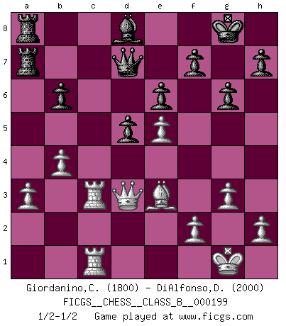 Last move : 1/2-1/2 2013 December 31 15:57:26 [Event "FICGS__CHESS__CLASS_B__000199"] [Site "FICGS"] [Date "2013.10.29"] [Round "1"] [White "Giordanino,Claudio"] [Black "DiAlfonso,Darren"] [Result "1/2-1/2"] [WhiteElo "1800"] [BlackElo "2000"] 1.e4 e6 2.d4 d5 3.Nd2 c5 4.Ngf3 Nf6 5.e5 Nfd7 6.c3 Nc6 7.Bd3 Qb6 8.O-O cxd4 9.cxd4 Nxd4 10.Nxd4 Qxd4 11.Nf3 Qb6 12.Qa4 Qb4 13.Qc2 Nc5 14.Bd2 Qa4 15.b3 Qd7 16.Be2 b6 17.Be3 a5 18.a3 a4 19.b4 Nb3 20.Rab1 Be7 21.Nd4 Ba6 22.Bxa6 Rxa6 23.Nxb3 axb3 24.Rxb3 O-O 25.Rc1 Rfa8 26.Qd3 Bd8 27.Rbc3 g6 28.g3 R6a7 1/2-1/2 French : Tarrasch, Open variation Kingside Castling by player White (move 8) Kingside Castling by player Black (move 24) This chess game ended in a draw. Follow this game move after move (download)The Pin is mightier than the sword. (Fred Reinfeld) Viele Opfer benötigen überhaupt keine konkrete Berechnung. Es genügt sich die entstehende Position kurz vorzustellen, um uns davon zu überzeugen, dass das Opfer korrekt ist. (Mikhail Nekhemyevich Tal) El Ajedrez es un mar en el cual un mosquito puede beber y un elefante puede bañarse. (Refrán Hindú) Les échecs sont un jeu par leur forme, un art par leur essence et une science par sa difficulté d'acquisition. Ils peuvent vous procurer autant de plaisir qu'un bon livre ou une belle musique, mais vous n'aurez une réelle joie que si vous arrivez à bien jouer. (Tigran Petrosian) If we don't succeed, we run the risk of failure. (George W. Bush)