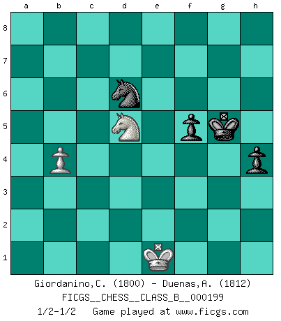 Last move : 1/2-1/2 2014 February 12 12:3:4 [Event "FICGS__CHESS__CLASS_B__000199"] [Site "FICGS"] [Date "2013.10.29"] [Round "1"] [White "Giordanino,Claudio"] [Black "Duenas,Alexis"] [Result "1/2-1/2"] [WhiteElo "1800"] [BlackElo "1812"] 1.d4 d5 2.c4 e6 3.Nc3 Nf6 4.cxd5 exd5 5.Bg5 Be7 6.e3 Nbd7 7.Qc2 c6 8.Bd3 O-O 9.h3 Re8 10.Nf3 Nf8 11.Bf4 Bd6 12.Bxd6 Qxd6 13.O-O-O Be6 14.g4 b5 15.Kb1 a6 16.Nd2 c5 17.dxc5 Qxc5 18.g5 N6d7 19.Nb3 Qe7 20.f4 Nb6 21.f5 Bd7 22.e4 dxe4 23.Bxe4 Rac8 24.f6 Qe5 25.Rde1 Qxg5 26.fxg7 Qxg7 27.Qf2 b4 28.Nd5 Nxd5 29.Bxd5 Rxe1+ 30.Rxe1 Bxh3 31.Nc5 Kh8 32.Nd3 Be6 33.Nxb4 a5 34.Bxe6 Nxe6 35.Nd5 Qg6+ 36.Ka1 Rc5 37.Nc3 Rf5 38.Qd2 h5 39.a3 Nc5 40.Ka2 Kh7 41.Qd1 Qa6 42.Rh1 Qe6+ 43.Kb1 Qe5 44.Re1 Qg3 45.Rh1 Kh6 46.Qd2+ Qg5 47.Qe2 Qf4 48.Qe8 Kg7 49.Ne2 Qe4+ 50.Qxe4 Nxe4 51.Rh4 Re5 52.Nd4 Nd6 53.Kc2 Kg6 54.Kd3 Rd5 55.Ke2 Rg5 56.b4 Rg2+ 57.Ke1 axb4 58.axb4 f5 59.Nf3 Rg4 60.Ne5+ Kg5 61.Nxg4 Kxh4 62.Nf6 Kg5 63.Nd5 h4 1/2-1/2 QGD : Exchange, positional line Kingside Castling by player Black (move 8) Queenside Castling by player White (move 13) 10 pieces endgame at move 57 : White KRNP , Black KRNPPP WHITE : King + 1 Rook 1 Knight 1 Pawn BLACK : King + 1 Rook 1 Knight 3 Pawns 9 pieces endgame at move 58 : White KRNP , Black KRNPP WHITE : King + 1 Rook 1 Knight 1 Pawn BLACK : King + 1 Rook 1 Knight 2 Pawns 8 pieces endgame at move 61 : White KRNP , Black KNPP WHITE : King + 1 Rook 1 Knight 1 Pawn BLACK : King + 1 Knight 2 Pawns 7 pieces endgame at move 61 : White KNP , Black KNPP WHITE : King + 1 Knight 1 Pawn BLACK : King + 1 Knight 2 Pawns This chess game ended in a draw. Follow this game move after move (download)Strategy requires thought, tactics require observation. (Max Euwe) Ich kenne keine einzige Person, die behaupten würde, Garri Kasparow sei ein guter Mensch (Nigel Short) Al jugar al Ajedrez entonces, podemos aprender: Primero: Previsión... Segundo: Prudencia... Tercero: Cautela... Y al final, aprendemos del Ajedrez el hábito de no ser desanimados por apariencias malas presentes en el estado de nuestros asuntos, el hábito de la esperanza por una oportunidad favorable y la perseveración de los secretos de los recursos. (Benjamin Franklin) Le jeu d'échecs est comme rejeté hors du temps. (Antoine de Saint-Exupéry) Wawaweewa ! (Borat: Cultural learnings of America for make benefit glorious nation of Kazakhstan)