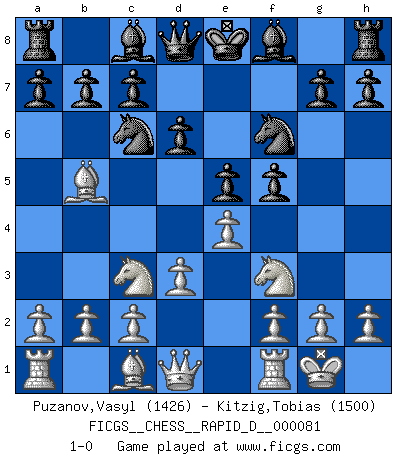 Last move : 1-0 2014 January 2 10:16:39 [Event "FICGS__CHESS__RAPID_D__000081"] [Site "FICGS"] [Date "2013.10.29"] [Round "1"] [White "Puzanov,Vasyl"] [Black "Kitzig,Tobias"] [Result "1-0"] [WhiteElo "1426"] [BlackElo "1500"] 1.e4 e5 2.Nf3 Nc6 3.Bb5 f5 4.d3 Nf6 5.Nc3 d6 6.O-O 1-0 This chess game has been lost on time (started : 2013.10.29 20:18:0) Ruy Lopez : Schliemann defense Kingside Castling by player White (move 6) Player White won this chess game. Follow this game move after move (download)Fischer wanted to give the Russians a taste of their own medicine. (Larry Evans) Im Schach gewinnt jeder. Hat man Freunde am Spiel - und das ist die Hauptsache - ist auch der Verlust einer Partie kein Unglück. (David Bronstein) Yo adoro todas la posiciones. Denme una partida posicional difícil, y la jugaré. Pero posiciones totalmente ganadas, no las tolero. (Hein Donner) Pour se monter efficace, un Cavalier a besoin d'avant-postes ! Les Cavaliers font les meilleurs bloqueurs de pions passés. Man with more than one clock never knows what time it is. (Chinese thought)