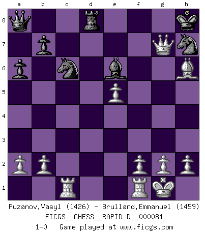 Last move : 1-0 2013 December 24 9:9:47 [Event "FICGS__CHESS__RAPID_D__000081"] [Site "FICGS"] [Date "2013.10.29"] [Round "1"] [White "Puzanov,Vasyl"] [Black "Brulland,Emmanuel"] [Result "1-0"] [WhiteElo "1426"] [BlackElo "1459"] 1.e4 c6 2.d4 d5 3.exd5 cxd5 4.c4 a6 5.Nc3 e6 6.Nf3 h6 7.cxd5 exd5 8.Bd3 Nf6 9.O-O Be7 10.Bf4 O-O 11.Ne5 Bd6 12.Rc1 Bxe5 13.dxe5 Nh7 14.Nxd5 Be6 15.Nc7 Nc6 16.Nxa8 Qxa8 17.Qc2 g6 18.Bxh6 Rd8 19.Bxg6 fxg6 20.Qxg6+ Kh8 21.Qg7+ 1-0 Caro-Kann : Panov-Botvinnik attack Kingside Castling by player White (move 9) Kingside Castling by player Black (move 10) Player White won this chess game. Follow this game move after move (download)Checkers is for tramps. (Paul Morphy) Wenn Capablanka heute auf der Schachbühne erscheinen würde, hätte er ein halbes Jahr gebraucht um sich die Schachtheorie anzueignen. Und dann hätte er alles und jeden besiegt. (Mikhail Moiseyevich Botvinik) Del Ajedrez se ha dicho que la vida no es lo suficientemente larga para él, pero eso es culpa de la vida, no del Ajedrez. (William Ewart Napier) Le système Elo représente seulement une moyenne. Il est simplement un indicateur de votre stabilité. (Anatoli Karpov) Life is the sum of all your choices. (Albert Camus)