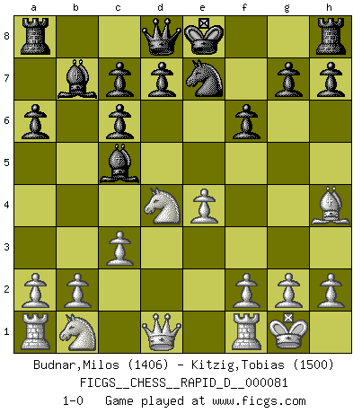 Last move : 1-0 2013 December 14 9:27:6 [Event "FICGS__CHESS__RAPID_D__000081"] [Site "FICGS"] [Date "2013.10.29"] [Round "1"] [White "Budnar,Milos"] [Black "Kitzig,Tobias"] [Result "1-0"] [WhiteElo "1406"] [BlackElo "1500"] 1.e4 e5 2.Nf3 Nc6 3.Bb5 Bc5 4.c3 a6 5.Bxc6 bxc6 6.d4 exd4 7.Nxd4 Bb7 8.O-O Ne7 9.Bg5 f6 10.Bh4 1-0 This chess game has been lost on time (started : 2013.10.29 20:18:0) Ruy Lopez : Classical defense, 4.c3 Kingside Castling by player White (move 8) Player White won this chess game. Follow this game move after move (download)Fischer is completely natural. He plays no roles. He's like a child. Very, very simple. (Zita Rajcsanyi) Die Leute spielen gegen mich seit 15 Jahren unter Ihren Möglichkeiten. (Robert James Fischer) Si no le temes a Spassky, entonces elimino el elemento del dinero. (Jim Slater) Les échecs, c'est l'imagination. (David Bronstein) Vladimir Ras-Putin is still alive... He is also a good actor, I saw him in the Lord of the Rings. (Rodolfo d'Ettorre)