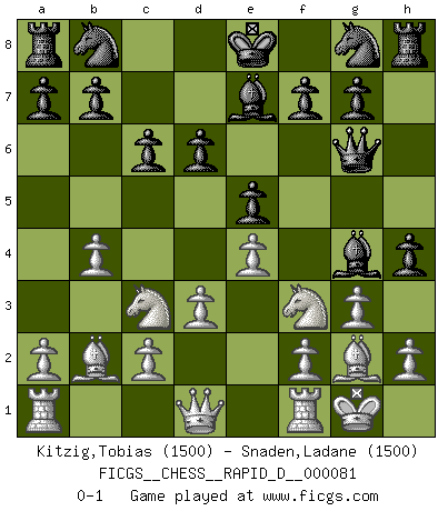 Last move : 0-1 2013 December 9 21:12:31 [Event "FICGS__CHESS__RAPID_D__000081"] [Site "FICGS"] [Date "2013.10.29"] [Round "1"] [White "Kitzig,Tobias"] [Black "Snaden,Ladane"] [Result "0-1"] [WhiteElo "1500"] [BlackElo "1500"] 1.g3 e5 2.Bg2 d6 3.d3 Qf6 4.Nf3 Be7 5.Nc3 c6 6.b4 Qg6 7.Bb2 h5 8.e4 Bg4 9.O-O h4 0-1 This chess game has been lost on time (started : 2013.10.29 20:18:0) Benko's Opening Kingside Castling by player White (move 9) Player Black won this chess game. Follow this game move after move (download)The sign of a great Master is his ability to win a won game quickly and painlessly. (Irving Chernev) Modernes Schach erfordert enorme Anspannung. Es ist für einen normalen Menschen unmöglich das auszuhalten. (Viktor Kortschnoi) La táctica fluye a partir de una posición superior. (Bobby Fischer) Toute estimation doit être constamment réévaluée. (Jacob Estrin) If things go wrong, don't go with them. (Roger Babson)