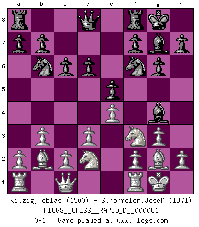 Last move : 0-1 2013 December 20 21:45:29 [Event "FICGS__CHESS__RAPID_D__000081"] [Site "FICGS"] [Date "2013.10.29"] [Round "1"] [White "Kitzig,Tobias"] [Black "Strohmeier,Josef"] [Result "0-1"] [WhiteElo "1500"] [BlackElo "1371"] 1.Nf3 Nf6 2.g3 g6 3.Bg2 Bg7 4.O-O O-O 5.d3 d6 6.e4 e5 7.b3 Bg4 8.Bb2 Nbd7 9.Nbd2 c6 10.Qc1 Nb6 0-1 This chess game has been lost on time (started : 2013.10.29 20:18:0) Reti : King's Indian attack Kingside Castling by player White (move 4) Kingside Castling by player Black (move 4) Player Black won this chess game. Follow this game move after move (download)No other master has such a terrific will to win. At the board he radiates danger, and even the strongest opponents tend to freeze, like rabbits when they smell a panther. Even his weaknesses are dangerous. As white, his opening game is predictable - you can make plans against it - but so strong that your plans almost never work. In the middle game his precision and invention are fabulous, and in the end game you simply cannot beat him. (Anonymous German Expert) Wir irren allesamt, nur jeder irrt anders. (Georg Christoph Lichtenberg) Hay jugadores fuertes y personas amables y yo soy un jugador fuerte. (Bobby Fischer) Votre prénom est 'Tactique', votre deuxième prénom est 'Tactique' et votre nom est 'Tactique'. (Ken Smith) We're missing something. (Gregory House, House M.D.)