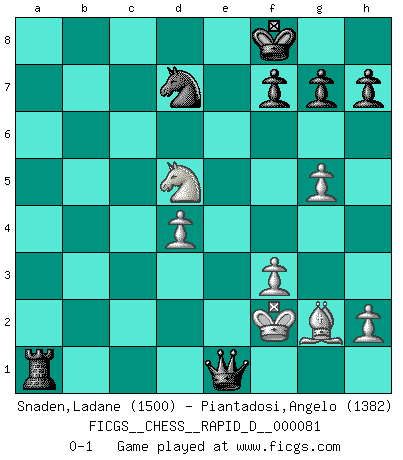 Last move : 0-1 2014 February 23 1:39:1 [Event "FICGS__CHESS__RAPID_D__000081"] [Site "FICGS"] [Date "2013.10.29"] [Round "1"] [White "Snaden,Ladane"] [Black "Piantadosi,Angelo"] [Result "0-1"] [WhiteElo "1500"] [BlackElo "1382"] 1.d4 d5 2.c4 e6 3.c5 b6 4.b4 a5 5.Qa4+ Qd7 6.Qxd7+ Bxd7 7.Bf4 axb4 8.f3 bxc5 9.e3 c4 10.a3 Bd6 11.Bxd6 cxd6 12.Nd2 Nf6 13.e4 O-O 14.exd5 exd5 15.g4 Nc6 16.Ne2 Rfe8 17.Kf2 c3 18.Nb3 Na5 19.Nxa5 Rxa5 20.Bg2 Bb5 21.Nf4 b3 22.Rhd1 b2 23.Rdb1 bxa1Q 24.Rxa1 Rea8 25.g5 Nd7 26.Nxd5 Rxa3 27.Rb1 Bc4 28.Ne7+ Kf8 29.Nf5 Ra1 30.Rxa1 Rxa1 31.Nxd6 Bd5 32.Nf5 c2 33.Ne3 c1Q 34.Nxd5 Qe1+ 0-1 This chess game has been lost on time (started : 2013.10.29 20:18:0) Queen's gambit declined Kingside Castling by player Black (move 13) Promotion Queen by player Black (move 23) Promotion Queen by player Black (move 33) Player Black won this chess game. Follow this game move after move (download)You are for me the Queen on d8 and I am the Pawn on d7 !! (Eduard Gufeld) Schach ist die gewalttätigste aller Sportarten. (Garry Kasparov) Yo no creo en la psicología. Yo creo en las buenas movidas. (Bobby Fischer) La victoire dans une partie d'Echecs appartient la plupart du temps à celui qui voit un peu plus loin que l'adversaire. (Lasker) Logic : The art of thinking and reasoning in strict accordance with the limitations and incapacities of the human misunderstanding. (Ambrose Bierce)