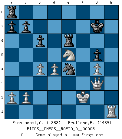 Last move : 0-1 2014 January 8 2:0:31 [Event "FICGS__CHESS__RAPID_D__000081"] [Site "FICGS"] [Date "2013.10.29"] [Round "1"] [White "Piantadosi,Angelo"] [Black "Brulland,Emmanuel"] [Result "0-1"] [WhiteElo "1382"] [BlackElo "1459"] 1.e4 c6 2.d4 d5 3.Nc3 e6 4.Nf3 Nd7 5.Bd3 dxe4 6.Nxe4 Ngf6 7.O-O Be7 8.c4 O-O 9.Bg5 Nxe4 10.Bxe7 Qxe7 11.Bxe4 Nf6 12.Bc2 Rd8 13.Re1 Qf8 14.Qe2 g6 15.Rad1 Qg7 16.Ne5 Nd7 17.f4 h6 18.Qg4 Nf6 19.Qg3 Nh5 20.Qh4 Re8 21.g4 Nf6 22.Kf2 Nd7 23.Rg1 Kf8 24.f5 g5 25.Qh3 Nf6 26.Rge1 Kg8 27.Qg3 Rd8 28.h4 Kh7 29.hxg5 hxg5 30.fxe6 Kg8 31.exf7+ Kf8 32.Ng6+ Kxf7 33.Re7+ Kg8 34.Rxg7+ Kxg7 35.Ne5 Be6 36.Bf5 Re8 37.Bxe6 Rxe6 38.Rh1 Ne4+ 0-1 Caro-Kann defense Kingside Castling by player White (move 7) Kingside Castling by player Black (move 8) Player Black won this chess game. Follow this game move after move (download)I'd rather have a Pawn than a finger. (Reuben Fine) Man kann eine Schachpartie nur gewinnen, wenn das Gleichgewicht gestört ist. In einer Stellung mit ungestörtem Gleichgewicht ist auch das größte Genie hilflos - in der Stellung steckt dann eben kein genialer Einfall. (Wilhelm Steinitz) Realmente no sabemos como el juego fue inventado, aunque hay sospechas. Tan pronto como descubramos a los culpables, se los haremos saber. (Bruce Pandolfini) La vie est comme un jeu d'échecs : nous esquissons un plan, mais celui-ci est tributaire de ce que daignent faire l'adversaire aux échecs et le destin dans la vie. (Arthur Schopenhauer) A person who never made a mistake never tried anything new. (Albert Einstein)