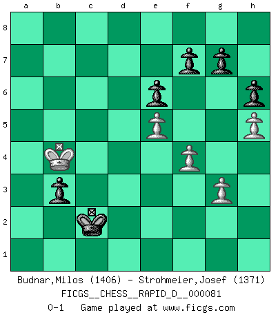Last move : 0-1 2014 February 22 20:33:55 [Event "FICGS__CHESS__RAPID_D__000081"] [Site "FICGS"] [Date "2013.10.29"] [Round "1"] [White "Budnar,Milos"] [Black "Strohmeier,Josef"] [Result "0-1"] [WhiteElo "1406"] [BlackElo "1371"] 1.e4 c5 2.Nf3 e6 3.d4 cxd4 4.Nxd4 Nf6 5.Nc3 Nc6 6.Ndb5 d6 7.Bg5 Be7 8.Bxf6 Bxf6 9.Nxd6+ Ke7 10.Nxc8+ Qxc8 11.Bd3 Rd8 12.O-O a6 13.Re1 Qc7 14.Qh5 h6 15.Qh3 Bxc3 16.bxc3 Kf8 17.Qf3 Ne5 18.Qe2 Qxc3 19.h3 Nxd3 20.cxd3 Qxd3 21.Rad1 Qxe2 22.Rxd8+ Rxd8 23.Rxe2 Ke7 24.e5 Rd1+ 25.Kh2 b5 26.f4 Rd4 27.g3 a5 28.h4 Kd7 29.h5 Kc6 30.Rf2 b4 31.Kh3 a4 32.Rc2+ Kb6 33.Kg4 b3 34.axb3 axb3 35.Rb2 Rb4 36.Kf3 Kb5 37.Ke2 Ka4 38.Kd2 Ka3 39.Kc3 Rc4+ 40.Kxc4 Kxb2 41.Kb4 Kc2 0-1 Sicilian : Anderssen variation Kingside Castling by player White (move 12) Player Black won this chess game. Follow this game move after move (download)White lost because he failed to remember the right continuation and had to think up the moves himself. (Siegbert Tarrasch) Der beste Spieler in einem Turnier gewinnt es nie. Er landet auf Platz zwei oder drei. (Siegbert Tarrasch) Si yo gano un torneo, yo lo gano por mí mismo. Yo hago las jugadas. Nadie me ayuda. (Bobby Fischer) Echiquier : carré parfait, comme la Jérusalem nouvelle décrite par l'auteur de l'Apocalypse, huit cases sur huit, exaltation du chiffre 4, symbole du cosmos aux quatre horizons... où le noir et le blanc, l'ombre et la lumière, le mal et le bien s'entremêlent et se conjuguent. (Robert Couffignal, Le Gambit du poète) Do not put your faith in what statistics say until you have carefully considered what they do not say. (William W. Watt)