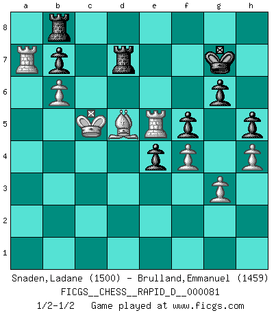 Last move : 1/2-1/2 2013 November 23 0:43:2 [Event "FICGS__CHESS__RAPID_D__000081"] [Site "FICGS"] [Date "2013.10.29"] [Round "1"] [White "Snaden,Ladane"] [Black "Brulland,Emmanuel"] [Result "1/2-1/2"] [WhiteElo "1500"] [BlackElo "1459"] 1.d4 d5 2.c4 c6 3.Nc3 e6 4.c5 Nf6 5.Bf4 Nbd7 6.Nf3 Be7 7.b4 O-O 8.a4 Re8 9.b5 cxb5 10.Nxb5 e5 11.Nxe5 Rf8 12.Nxd7 Bxd7 13.Nc7 Rc8 14.Nb5 Bxb5 15.axb5 Ra8 16.g3 Re8 17.Bh3 Nh5 18.Bc1 Bg5 19.f4 Be7 20.e4 dxe4 21.Qxh5 g6 22.Qd1 Bf6 23.Bb2 Bg7 24.O-O f5 25.Bg2 Re7 26.Qd2 Rd7 27.Qe3 Bxd4 28.Bxd4 Rxd4 29.Qb3+ Qd5 30.Qxd5+ Rxd5 31.Rfd1 Rxc5 32.Bf1 Rc7 33.b6 Re7 34.Rxa7 Rb8 35.Bc4+ Kg7 36.Rd6 h6 37.Kf2 Rc8 38.Bd5 Rb8 39.Ke3 Kh7 40.h3 h5 41.h4 Kg7 42.Re6 Rd7 43.Kd4 Kh7 44.Re5 Kg7 45.Kc5 Kf6 46.Re6+ Kg7 47.Re5 Kf8 48.Re6 Kg7 49.Re5 1/2-1/2 QGD Slav defense Kingside Castling by player Black (move 7) Kingside Castling by player White (move 24) This chess game ended in a draw. Follow this game move after move (download)In complicated positions, Bobby Fischer hardly had to be afraid of anybody. (Paul Keres) Kritik überlasse ich den Spießern. Ich zeige nichts, wofür ich mich schämen muss. (Alexandra Kosteniuk) Alguna parte de un error es siempre correcto. (Savielly Tartakover) Les écrivains ont utilisé les échecs pour analyser les côtés extrêmes de la nature humaine. Dans ce cadre, les échecs offrent un champ d'expérimentation idéal. Mais on pourrait faire la même chose avec la peinture. Et là, en vous référant à Van Gogh, vous ne tirerez pas de conclusion définitive sur les peintres. (Gary Kasparov) Life is like a ten-speed bicycle: most of us have gears we never use. (Charles M. Schulz)