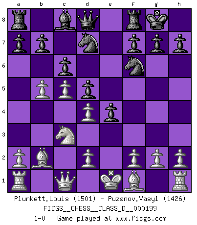 Last move : 1-0 2014 February 2 0:12:58 [Event "FICGS__CHESS__CLASS_D__000199"] [Site "FICGS"] [Date "2013.10.29"] [Round "1"] [White "Plunkett,Louis"] [Black "Puzanov,Vasyl"] [Result "1-0"] [WhiteElo "1501"] [BlackElo "1426"] 1.b4 e5 2.b5 d5 3.Bb2 Nd7 4.e3 Bd6 5.Nf3 Ngf6 6.c4 c6 7.Qc1 e4 8.Nd4 Be5 9.Nc3 Bxd4 10.exd4 O-O 11.c5 1-0 Polish (Sokolsky) opening Kingside Castling by player Black (move 10) Player White won this chess game. Follow this game move after move (download)The tactician knows what to do when there is something to do; whereas the strategian knows what to do when there is nothing to do. (Gerald Abrahams) Es ist im Leben wie im Schachspiel. Wir entwerfen einen Plan, dieser bleibt jedoch bedingt durch das, was im Schachspiel dem Gegner, im Leben dem Schicksal zu tun belieben wird. (Arthur Schopenhauer) Me dio la sensación de como si yo estuviera jugando en contra del mismo Ajedrez. - al estar jugando en contra de Robert Fischer (Walter Shipman) Les Echecs ont trois composantes : le temps, l'espace et le matériel en dernier. (Mikhail Tal) Remember : Your focus determines your reality. (Qui-Gon Jinn in Star Wars ep.1)