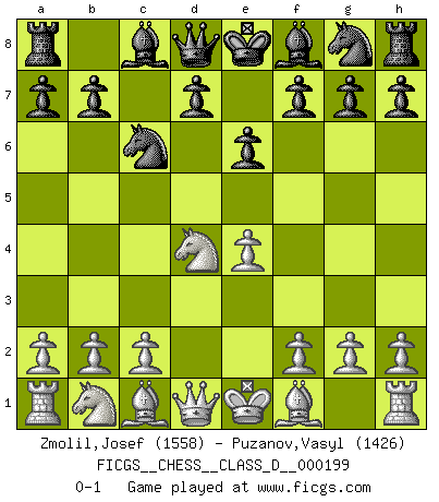 Last move : 0-1 2014 February 8 12:47:38 [Event "FICGS__CHESS__CLASS_D__000199"] [Site "FICGS"] [Date "2013.10.29"] [Round "1"] [White "Zmolil,Josef"] [Black "Puzanov,Vasyl"] [Result "0-1"] [WhiteElo "1558"] [BlackElo "1426"] 1.e4 c5 2.Nf3 e6 3.d4 cxd4 4.Nxd4 Nc6 0-1 Sicilian defense Player Black won this chess game. Follow this game move after move (download)In Fischer's hands, a slight theoretical advantage is as good a being a Queen ahead. (Isaac Kashdan) Ich kenne keine einzige Person, die behaupten würde, Garri Kasparow sei ein guter Mensch (Nigel Short) Después de la respuesta de las negras a 1.e4 con 1..e5, se quedan siempre tratando de entrar dentro del juego. (Howard Staunton) Il vaut toujours mieux jouer un plan faux de façon logique que de n'avoir pas de plan du tout. (Victor Kortchnoï) Macintosh - we might not get everything right, but at least we knew the century was going to end. (Douglas Adams)