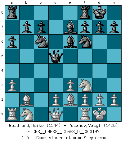 Last move : 1-0 2014 February 2 0:13:40 [Event "FICGS__CHESS__CLASS_D__000199"] [Site "FICGS"] [Date "2013.10.29"] [Round "1"] [White "Goldmund,Heike"] [Black "Puzanov,Vasyl"] [Result "1-0"] [WhiteElo "1544"] [BlackElo "1426"] 1.b4 e5 2.Bb2 Bxb4 3.Bxe5 Nf6 4.a3 Be7 5.c4 Nc6 6.Bb2 d5 7.cxd5 Qxd5 8.e3 Be6 9.Nf3 O-O 10.Be2 a6 11.O-O 1-0 Polish (Sokolsky) opening Kingside Castling by player Black (move 9) Kingside Castling by player White (move 11) Player White won this chess game. Follow this game move after move (download)A great player and a great example for many. His book My 60 Memorable Games had a big impact on me. It is a shame he didn't continue to enrich the world of chess with his unparalleled understanding after 1972. (Jan Timman, about Bobby Fischer's death) Es tut gut, die Entwicklungsperiode von, [...] demokratischem Geist durchdringen zu lassen. Wie undemokratisch wäre es doch beispielsweise, den einen Offizier große Spaziertouren vornehmen zu lassen, während die anderen zu Hause säßen und sich entsetzlich langweilten. (Aaron Nimzowitsch) El Ajedrez moderno está demasiado preocupado con cosas como la estructura de Peones. Olvidenlo, el Jaque Mate termina la partida. (Nigel Short) On entre au jeu d'Echecs comme on entre en Religion. Pour le joueur d'Echecs, la partie d'Echecs c'est l'office, la messe, le défilé du 1er Mai, le dépôt de gerbe au Monument aux Morts. C'est un drame sacré. (Michel Roos) If computers get too powerful, we can organize them into committees. That'll do them in. (Anonymous)