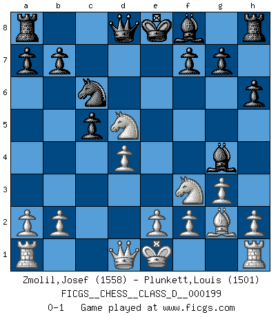 Last move : 0-1 2014 February 8 12:47:2 [Event "FICGS__CHESS__CLASS_D__000199"] [Site "FICGS"] [Date "2013.10.29"] [Round "1"] [White "Zmolil,Josef"] [Black "Plunkett,Louis"] [Result "0-1"] [WhiteElo "1558"] [BlackElo "1501"] 1.d4 d5 2.c4 e6 3.Nc3 c5 4.cxd5 exd5 5.Nf3 Nc6 6.g3 Nf6 7.Bg2 Bg4 8.Bg5 h6 9.Bxf6 Qxf6 10.Nxd5 Qd8 0-1 QGD : Tarrasch, Wagner variation Player Black won this chess game. Follow this game move after move (download)Chess teaches you to control the initial excitement you feel when you see something that looks good and it trains you to think objectively when you're in trouble. (Stanley Kubrick) Man wirke der falschen Auffassung entgegen, als ob jeder Zug Unmittelbares zu leisten habe; auch Werte- und Ruhezüge haben ihre Existenzberechtigung. (Aaron Nimzowitsch) En el Ajedrez, cuando menos, el valiente hereda la tierra. (Edmar Mednis) Roi des jeux et jeu des rois, les échecs portent en eux un sentiment d'infini. Ils donnent à celui qui s'est efforcé d'en approfondir les arcanes l'impression de n'être pas à la mesure de l'homme; en fait, ils constituent un résumé de l'univers, un microcosme, et figurent cette grande échelle qui, dans les plans de la lumière descend jusqu'à la matière, qui des abîmes insondables remonte jusqu'en l'infini de Dieu. (Pyrame) However beautiful the strategy, you should occasionally look at the results. (Winston Churchill)