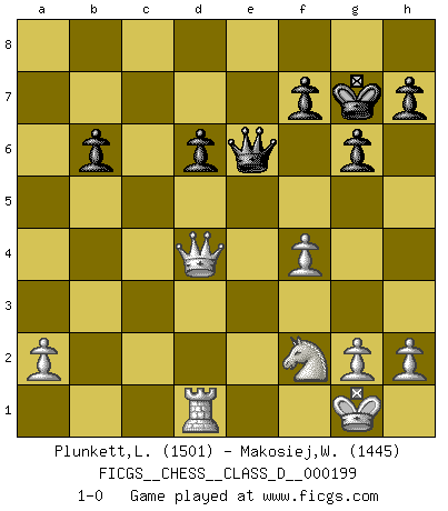 Last move : 1-0 2014 March 25 22:38:14 [Event "FICGS__CHESS__CLASS_D__000199"] [Site "FICGS"] [Date "2013.10.29"] [Round "1"] [White "Plunkett,Louis"] [Black "Makosiej,Wladyslaw"] [Result "1-0"] [WhiteElo "1501"] [BlackElo "1445"] 1.b4 e5 2.b5 b6 3.Bb2 d6 4.c4 a6 5.Nc3 Bb7 6.Nf3 Nd7 7.e3 Nc5 8.Be2 e4 9.Nd4 Ne7 10.O-O axb5 11.cxb5 g6 12.Nc6 Nxc6 13.bxc6 Bxc6 14.Qc2 Bg7 15.Rfb1 O-O 16.Nd1 Ba4 17.Qc1 Nd3 18.Bxd3 exd3 19.Bxg7 Kxg7 20.Qc3+ Kg8 21.Qxd3 Qg5 22.Qc4 Bd7 23.f4 Qh5 24.Qxc7 Bf5 25.Rc1 Be4 26.Qc4 Rfc8 27.Qxe4 Rxc1 28.Qxa8+ Kg7 29.Rxc1 Qe2 30.Nf2 Qxd2 31.Rd1 Qxe3 32.Qa4 Qe6 33.Qd4+ 1-0 Polish (Sokolsky) opening Kingside Castling by player White (move 10) Kingside Castling by player Black (move 15) Player White won this chess game. Follow this game move after move (download)Many Chess players were surprised when after the game, Fischer quietly explained: 'I had already analyzed this possibility' in a position which I thought was not possible to foresee from the opening. (Mikhail Tal) Wie kann ich Remis annehmen? Ich weiß ja gar nicht, wie ich stehe! (Fritz Sämisch) Nada excita más a Grandes Maestros aburridos que una novedad teórica. (Dominic Lawson) Vous n'êtes pas toujours obligé de jouer le meilleur coup. Un coup doit être actif, entreprenant, correct et beau ! (David Bronstein) Philosophers use a language that is already deformed as though by shoes that are too tight. (Ludwig Wittgenstein)