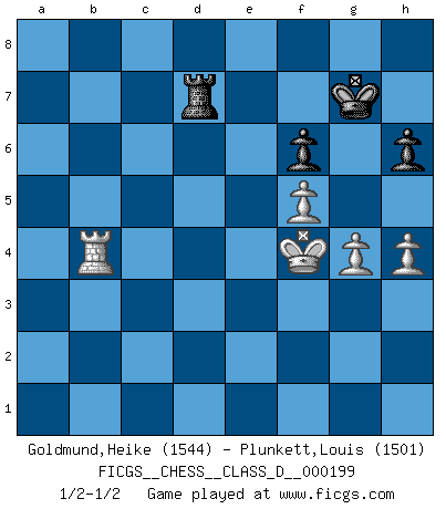 Last move : 1/2-1/2 2014 July 12 14:21:45 [Event "FICGS__CHESS__CLASS_D__000199"] [Site "FICGS"] [Date "2013.10.29"] [Round "1"] [White "Goldmund,Heike"] [Black "Plunkett,Louis"] [Result "1/2-1/2"] [WhiteElo "1544"] [BlackElo "1501"] 1.b4 c6 2.e3 Nf6 3.c4 e6 4.a3 d5 5.cxd5 cxd5 6.Bb2 Be7 7.Nf3 Nbd7 8.Be2 O-O 9.O-O Bd6 10.Nc3 a6 11.Qc2 Qc7 12.Rfc1 Qb8 13.Na4 b5 14.Nc5 Nxc5 15.bxc5 Be7 16.c6 Bd6 17.c7 Qb7 18.Bxf6 gxf6 19.Bd3 f5 20.Qc3 f6 21.Nh4 Bd7 22.f3 Rac8 23.e4 Bxc7 24.Qb4 Qb8 25.Qe7 Bb6+ 26.Kh1 Rf7 27.Qb4 Rg7 28.exf5 e5 29.g4 Bd4 30.Rab1 Bf2 31.Ng2 Qa7 32.Qd6 Rf7 33.Rxc8+ Bxc8 34.Rc1 Qb7 35.Rc6 Qd7 36.Qxd7 Bxd7 37.Rxa6 Kg7 38.Ne3 Bxe3 39.dxe3 Be8 40.Kg2 Rc7 41.Rb6 Rc3 42.Bxb5 Bxb5 43.Rxb5 Rxa3 44.Rxd5 Rxe3 45.h4 h6 46.Kf2 Rc3 47.Rd7+ Kg8 48.Ke2 Rb3 49.Rd3 Rb4 50.Ke3 Ra4 51.Rb3 Ra7 52.Rb6 Kg7 53.Ke4 Rd7 54.Rb4 Kf7 55.f4 exf4 56.Kxf4 Kg7 1/2-1/2 Polish : Outflank variation Kingside Castling by player Black (move 8) Kingside Castling by player White (move 9) 10 pieces endgame at move 55 : White KRPPP , Black KRPPP WHITE : King + 1 Rook 3 Pawns BLACK : King + 1 Rook 3 Pawns 9 pieces endgame at move 56 : White KRPPP , Black KRPP WHITE : King + 1 Rook 3 Pawns BLACK : King + 1 Rook 2 Pawns This chess game ended in a draw. Follow this game move after move (download)The passion for playing Chess is one of the most unaccountable in the world. (H.G. Wells) Den Ruhm habe ich schon, jetzt brauche ich noch das Geld. (Wilhelm Steinitz) Debió haber existido una vez en que los hombres eran semidióses, de otra manera no hubiesen podido inventar el Ajedrez. (Gustav Schenk) La conception d'un plan est le processus par lequel un joueur exploite les avantages de sa position tout en s'efforçant d'en réduire au minimum les inconvénients. Afin de garantir le succès, un plan doit toujours se fonder sur un diagnostic objectif des particularités d'une position. La conception d'un plan est d'autant plus difficile que la position est équilibrée, et grandement facilitée lorsqu'il n'existe qu'un seul plan susceptible de répondre aux exigences de la position. (Harry Golombek) Mandala - that's it! 16x16 squares as multiple of the four and the eight because of the Four Noble Truths and the Noble Eightfold Path. (Heinz-Georg Lehnhoff about Big Chess)