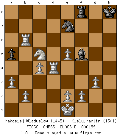 Last move : 1-0 2014 June 16 23:21:56 [Event "FICGS__CHESS__CLASS_D__000199"] [Site "FICGS"] [Date "2013.10.29"] [Round "1"] [White "Makosiej,Wladyslaw"] [Black "Kiely,Martin"] [Result "1-0"] [WhiteElo "1445"] [BlackElo "1501"] 1.d4 d5 2.c4 e5 3.dxe5 Bb4+ 4.Bd2 a5 5.a3 Bxd2+ 6.Nxd2 d4 7.Ngf3 c5 8.Nb3 b6 9.Qc2 Ne7 10.Rd1 Bd7 11.g3 O-O 12.Bg2 Nbc6 13.Ng5 g6 14.h4 Bf5 15.Qd2 Qc7 16.Qf4 Rad8 17.h5 h6 18.Nf3 g5 19.Nxg5 hxg5 20.Qxg5+ Kh8 21.h6 Rg8 22.Qf6+ Kh7 23.Qxf7+ Kh8 24.Bxc6 Rdf8 25.Qh5 Qxc6 26.h7 Rg6 27.Qh4 Rh6 28.Qxh6 Qxh6 29.Rxh6 Bxh7 30.Rxb6 Bc2 31.Rd2 Be4 32.Nxc5 Bf5 33.Rxd4 1-0 QGD : Albin counter-gambit Kingside Castling by player Black (move 11) Player White won this chess game. Follow this game move after move (download)I'm not a materialistic person, in that, I don't suffer the lack or loss of money. The absence of worldly goods I don't look back on. For Chess is a way I can be as materialistic as I want without having to sell my soul. (Jamie Walter Adams) Schach ist mein Leben, meine Leidenschaft, was ich gelernt habe und seit meinem 14. Lebensjahr profimässig praktiziere. Darauf zu verzichten, würde mir sehr schwer fallen. (Viktor Kortschnoi) Con el tiempo, empecé a progresar en partidas decisivas. Tal vez porque me di cuenta de una simple verdad: no solo estaba yo nervioso sino también mi oponente. (Mikhail Tal) Aux échecs, les retours au sommet sont rares : les dommages psychologiques consécutifs à une défaite sont trop sévères. (Daily Telegraph) Every man's memory is his private literature. (Aldous Huxley)