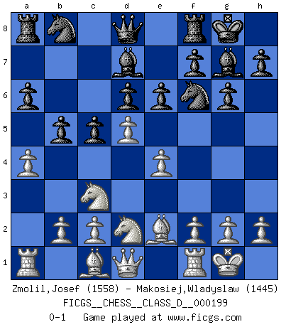 Last move : 0-1 2014 February 8 12:47:9 [Event "FICGS__CHESS__CLASS_D__000199"] [Site "FICGS"] [Date "2013.10.29"] [Round "1"] [White "Zmolil,Josef"] [Black "Makosiej,Wladyslaw"] [Result "0-1"] [WhiteElo "1558"] [BlackElo "1445"] 1.e4 g6 2.d4 Bg7 3.Nc3 c5 4.d5 d6 5.Nf3 Nf6 6.Bb5+ Bd7 7.a4 O-O 8.O-O a6 9.Be2 e6 10.Nd2 b5 0-1 Robatsch defense Kingside Castling by player Black (move 7) Kingside Castling by player White (move 8) Player Black won this chess game. Follow this game move after move (download)The mistakes are there, waiting to be made. (Savielly Tartakower) Ein Buch ist ein Spiegel; wenn ein Affe hineinsieht, so kann kein Apostel heraus gucken. (Georg Christoph Lichtenberg) Un jugador que es sorprendido, esta derrotado a medias. (Proverbio) Toutes les manuvres exécutées sur une colonne ouverte ont pour but ultime l'intrusion définitive sur la septième ou la huitième rangée, en plein cur de la position ennemie. (Aaron Nimzovitch) Fame, I have already. Now I need the money. (an elderly Steinitz)