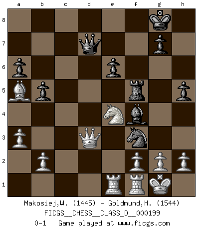 Last move : 0-1 2014 April 2 22:26:8 [Event "FICGS__CHESS__CLASS_D__000199"] [Site "FICGS"] [Date "2013.10.29"] [Round "1"] [White "Makosiej,Wladyslaw"] [Black "Goldmund,Heike"] [Result "0-1"] [WhiteElo "1445"] [BlackElo "1544"] 1.d4 d5 2.c4 c6 3.Nc3 Nf6 4.Nf3 Bf5 5.Bg5 e6 6.Nh4 Bg6 7.cxd5 cxd5 8.e3 Bd6 9.Bb5+ Nc6 10.Qa4 O-O 11.O-O Qc7 12.a3 a6 13.Be2 b5 14.Qd1 Nh5 15.Nxg6 fxg6 16.Bxh5 gxh5 17.Qxh5 Rf5 18.Qg4 Qf7 19.e4 dxe4 20.Nxe4 Bf4 21.Rae1 h6 22.Bh4 h5 23.Qe2 Nxd4 24.Qd3 Rd8 25.Bxd8 Qd7 26.Ba5 Nf3+ 0-1 QGD Slav defense Kingside Castling by player Black (move 10) Kingside Castling by player White (move 11) Player Black won this chess game. Follow this game move after move (download)Via the squares on the chessboard, the Indians explain the movement of time and the age, the higher influences which control the world and the ties which link Chess with the human soul. (Al-Masudi) Ein Teil des Fehlers ist immer korrekt. (Savielly Grigorievitsch Tartakower) Si el Ajedrez es una ciencia, es la mas inexacta. Si el Ajedrez es un arte, es demasiado inexacto para ser visto como tal. Si el Ajedrez es un deporte, es demasiado esotérico. Si el Ajedrez es un juego, es demasiado exigente para ser solo un juego. Si el Ajedrez es una aventura, es una muy demandante. Si el Ajedrez es una pasión, es una muy gratificante. Si el Ajedrez es la vida, es una muy triste. (Anónimo) Donnez-moi un Cavalier en 6e et je gagnerais toutes mes parties. (Steinitz) A generalist learns less and less about more and more until he knows nothing about everything. (Author unknown)