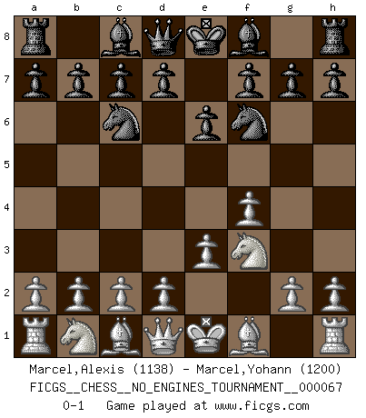 Last move : 0-1 2014 January 12 10:52:45 [Event "FICGS__CHESS__NO_ENGINES_TOURNAMENT__000067"] [Site "FICGS"] [Date "2013.10.29"] [Round "1"] [White "Marcel,Alexis"] [Black "Marcel,Yohann"] [Result "0-1"] [WhiteElo "1138"] [BlackElo "1200"] 1.f4 Nc6 2.Nf3 Nf6 3.e3 e6 0-1 This chess game has been lost on time (started : 2013.10.29 23:56:0) Bird's Opening Player Black won this chess game. Follow this game move after move (download)Fischer is the strongest player in the world. In fact, the strongest player who ever lived. (Larry Evans) Im Schach nämlich geht es darum, daß Ich des Gegners klein zu kriegen, sein Ego zu zerbrechen und zu zermahlen, seine Selbstachtung zu zertreten und zu verscharren und seine ganze mißachtenswerte sogenannte Persönlichkeit ein für alle Mal tot zu hacken und zu zerstampfen und dadurch die menschliche Gesellschaft von einer stinkenden Pestbeule zu befreien. Es ist ein königliches Spiel. (Robert James Fischer) La enorme capacidad mental, en la que sin ella no puede un jugador de Ajedrez existir, es demasiado requerida por el Ajedrez al grado de que nunca podrá liberar su mente de este juego. (Albert Einstein) Les échecs sont plus proches de l'art de l'assassinat que de l'art de la guerre. (Arturo Perez-Reverte) Experiences are the keys to life. (Daniel Parmet)