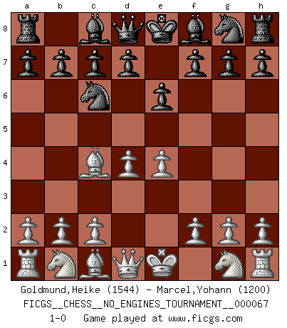 Last move : 1-0 2013 December 15 9:39:50 [Event "FICGS__CHESS__NO_ENGINES_TOURNAMENT__000067"] [Site "FICGS"] [Date "2013.10.29"] [Round "1"] [White "Goldmund,Heike"] [Black "Marcel,Yohann"] [Result "1-0"] [WhiteElo "1544"] [BlackElo "1200"] 1.e4 Nc6 2.Bc4 e6 3.d4 1-0 This chess game has been lost on time (started : 2013.10.29 23:56:0) KP : Nimzovich defense Player White won this chess game. Follow this game move after move (download)All I want to do, ever, is just play Chess. (Bobby Fischer) Ich trinke, ich rauche, ich spiele, ich liebe Frauen aber Fernschach ist ein Laster, das ich nicht habe. (Mikhail Nekhemyevich Tal) Para mi, el Ajedrez es la vida y cada partida es como una nueva vida. Todo jugador de Ajedrez suele vivir muchas vidas durante su vida. (Eduard Gufeld) En blitz, le Cavalier l'emporte sur le Fou. (Vlastimil Hort) Pushing plastic is for the many, pushing virtual pieces is for the fewer, pushing wood is for the very few. (Normajean Yates)