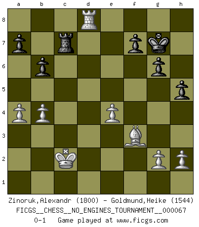 Last move : 0-1 2014 May 13 9:19:28 [Event "FICGS__CHESS__NO_ENGINES_TOURNAMENT__000067"] [Site "FICGS"] [Date "2013.10.29"] [Round "1"] [White "Zinoruk,Alexandr"] [Black "Goldmund,Heike"] [Result "0-1"] [WhiteElo "1800"] [BlackElo "1544"] 1.d4 d5 2.c4 e5 3.dxe5 Be6 4.cxd5 Bxd5 5.Nc3 Nc6 6.Nxd5 Nxe5 7.Nf3 Nxf3+ 8.exf3 c6 9.Nc3 Qxd1+ 10.Kxd1 Rd8+ 11.Kc2 Bc5 12.Be3 Bxe3 13.fxe3 Nf6 14.Be2 O-O 15.Rad1 Nd5 16.Nxd5 cxd5 17.e4 Rc8+ 18.Kb1 dxe4 19.fxe4 Rfe8 20.Bf3 g6 21.Rc1 Rcd8 22.Rhd1 Rxd1 23.Rxd1 Re7 24.Rd8+ Kg7 25.Kc2 b6 26.b4 h5 27.a4 Rc7+ 0-1 This chess game has been lost on time (started : 2013.10.29 23:56:0) QGD : Albin counter-gambit Kingside Castling by player Black (move 14) Player Black won this chess game. Follow this game move after move (download)My opponents make good moves too. Sometimes I don't take these things into consideration. (Bobby Fischer) Ich las kürzlich ein Buch von Nietzsche. Er sagte Religion verdumme nur die Menschen. Ich stimme zu. (Robert James Fischer) El Ajedrez es una hermosa aventura. (Bent Larsen) J'apprécie les joueurs d'est-indienne, c'est grâce à eux que je nourris ma famille depuis tant d'années. (Petrosian) I'll be back. (Arnold Schwarzenegger)