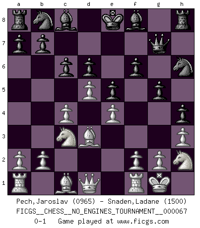 Last move : 0-1 2014 February 8 12:50:0 [Event "FICGS__CHESS__NO_ENGINES_TOURNAMENT__000067"] [Site "FICGS"] [Date "2013.10.29"] [Round "1"] [White "Pech,Jaroslav"] [Black "Snaden,Ladane"] [Result "0-1"] [WhiteElo "0965"] [BlackElo "1500"] 1.d4 d6 2.c4 f6 3.e4 e5 4.d5 Qe7 5.Bd3 h5 6.Nf3 h4 7.h3 g5 8.Nc3 c6 9.Nh2 Qg7 10.O-O Nh6 0-1 Old Indian defense Kingside Castling by player White (move 10) Player Black won this chess game. Follow this game move after move (download)A passed Pawn increases in strength as the number of pieces on the board diminishes. (Capablanca) Ich habe Kasparov in Rente geschickt. (Veselin Topalov) Entre mas años cumplo, mas valoro los Peones. (Keres) Roi des jeux et jeu des rois, les échecs portent en eux un sentiment d'infini. Ils donnent à celui qui s'est efforcé d'en approfondir les arcanes l'impression de n'être pas à la mesure de l'homme; en fait, ils constituent un résumé de l'univers, un microcosme, et figurent cette grande échelle qui, dans les plans de la lumière descend jusqu'à la matière, qui des abîmes insondables remonte jusqu'en l'infini de Dieu. (Pyrame) We cannot be sure of having something to live for unless we are willing to die for it. (Ernesto Che Guevara)
