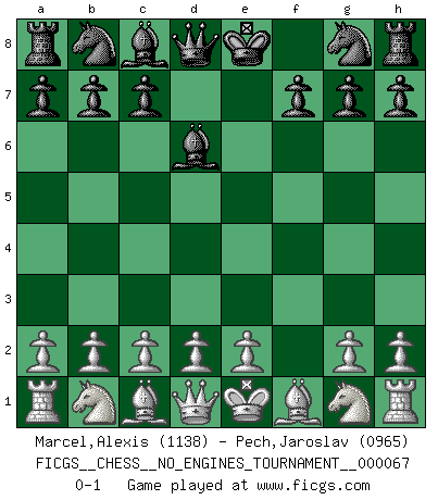 Last move : 0-1 2013 December 30 10:11:5 [Event "FICGS__CHESS__NO_ENGINES_TOURNAMENT__000067"] [Site "FICGS"] [Date "2013.10.29"] [Round "1"] [White "Marcel,Alexis"] [Black "Pech,Jaroslav"] [Result "0-1"] [WhiteElo "1138"] [BlackElo "0965"] 1.f4 e5 2.fxe5 d6 3.exd6 Bxd6 0-1 This chess game has been lost on time (started : 2013.10.29 23:56:0) Bird : From gambit Player Black won this chess game. Follow this game move after move (download)Adequate compensation for a sacrifice is having a sound combination leading to a winning position; adequate compensation for a blunder is having your opponent snatch defeat from the jaws of victory. (Bruce A. Moon) Irgendwie scheint mir sonntags früh um 9 Uhr der Killerinstinkt verloren gegangen zu sein. (Alexej Shirov) Un Peón pasado aumenta su poder a medida de que el número de piezas en el tablero disminuye. (Capablanca) Le jeu d'échecs est comme rejeté hors du temps. (Antoine de Saint-Exupéry) Strategy without tactics is the slowest route to victory. Tactics without strategy is the noise before defeat. (Sun Tzu)