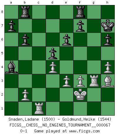 Last move : 0-1 2014 April 26 8:20:21 [Event "FICGS__CHESS__NO_ENGINES_TOURNAMENT__000067"] [Site "FICGS"] [Date "2013.10.29"] [Round "1"] [White "Snaden,Ladane"] [Black "Goldmund,Heike"] [Result "0-1"] [WhiteElo "1500"] [BlackElo "1544"] 1.d4 d5 2.c4 c6 3.Nc3 Nf6 4.Bf4 Bf5 5.Qb3 b6 6.Nf3 e6 7.Ne5 Bd6 8.f3 O-O 9.g3 Qc7 10.a4 Nbd7 11.Nxd7 Qxd7 12.Bxd6 Qxd6 13.Bg2 Rab8 14.g4 Bg6 15.h4 h6 16.g5 Qg3+ 17.Kf1 Nh5 18.Rh3 Qf4 19.Re1 Ng3+ 20.Kf2 Ne4+ 21.Nxe4 Bxe4 22.e3 Qf5 23.gxh6 Bc2 24.Qa3 gxh6 25.Rg3+ Kh7 26.Bh3 Qd3 27.Qxd3+ Bxd3 28.cxd5 cxd5 29.Rd1 Bc2 30.Rc1 Bxa4 0-1 QGD Slav defense Kingside Castling by player Black (move 8) Player Black won this chess game. Follow this game move after move (download)Chess demands total concentration. (Bobby Fischer) Ich kenne Menschen, die allen Willen der Welt besitzen und doch nicht Schach spielen können. (Robert James Fischer) ¿Esta Bobby Fischer algo cuerdo?. (Salo Flohr) Karpov est une pièce de musée. (Garry Kasparov) Games, world of games... There's always an opponent, and there's always a victim. (Revolver, movie)