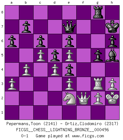 Last move : 0-1 2013 November 1 5:19:46 [Event "FICGS__CHESS__LIGHTNING_BRONZE__000496"] [Site "FICGS"] [Date "2013.10.31"] [Round "1"] [White "Pepermans,Toon"] [Black "Ortiz,Clodomiro"] [Result "0-1"] [WhiteElo "2141"] [BlackElo "2317"] 1.d4 f5 2.Nc3 d5 3.Bf4 Nf6 4.Nb5 Na6 5.e3 e6 6.Nf3 c6 7.Nc3 Nb8 8.Bd3 Be7 9.O-O Nh5 10.Be5 Nd7 11.Ne2 a6 12.c4 Nxe5 13.Nxe5 O-O 14.f4 Nf6 15.Rc1 Bd7 16.a3 Bd6 17.c5 Bc7 18.Rf3 Be8 19.Qe1 Bh5 20.Rh3 Qe7 21.Nc3 Rfe8 22.Rg3 Rad8 23.Rh3 Bb8 24.b4 Bc7 25.Bc2 Rc8 26.Rg3 Ng4 27.Nd3 Bg6 28.h3 Nf6 29.Ne5 Bh5 30.Bd3 Rcd8 31.Bc2 Bxe5 32.fxe5 Ne4 33.Bxe4 fxe4 34.Rc2 Rf8 35.Rf2 Rxf2 36.Qxf2 Kh8 37.Ne2 g5 38.Qe1 h6 39.Kh2 Rg8 40.Qf2 Kh7 0-1 This chess game has been lost on time (started : 2013.10.31 20:9:3) Dutch Kingside Castling by player White (move 9) Kingside Castling by player Black (move 13) Player Black won this chess game. Follow this game move after move (download)No other master has such a terrific will to win. At the board he radiates danger, and even the strongest opponents tend to freeze, like rabbits when they smell a panther. Even his weaknesses are dangerous. As white, his opening game is predictable - you can make plans against it - but so strong that your plans almost never work. In the middle game his precision and invention are fabulous, and in the end game you simply cannot beat him. (Anonymous German Expert) Nicht daß Diemer aus Opportunismus Mitglied der NSDAP geworden wäre. Er war ein Fanatiker, in allem, was er tat. (Hans Ree) El Ajedrez es en su esencia, un juego. En su forma, un arte. Y en su ejecución, una ciencia. (Baron Tassilo) Les échecs sont un jeu terrible. Si vous n'avez pas le centre, votre adversaire a une position plus libre. Par contre, si vous avez le centre, alors vous avez vraiment quelque chose pour laquelle vous inquiéter ! (Siegbert Tarrasch) Wikichess, chess moves explained by 'experimented' players. (Thibault de Vassal)
